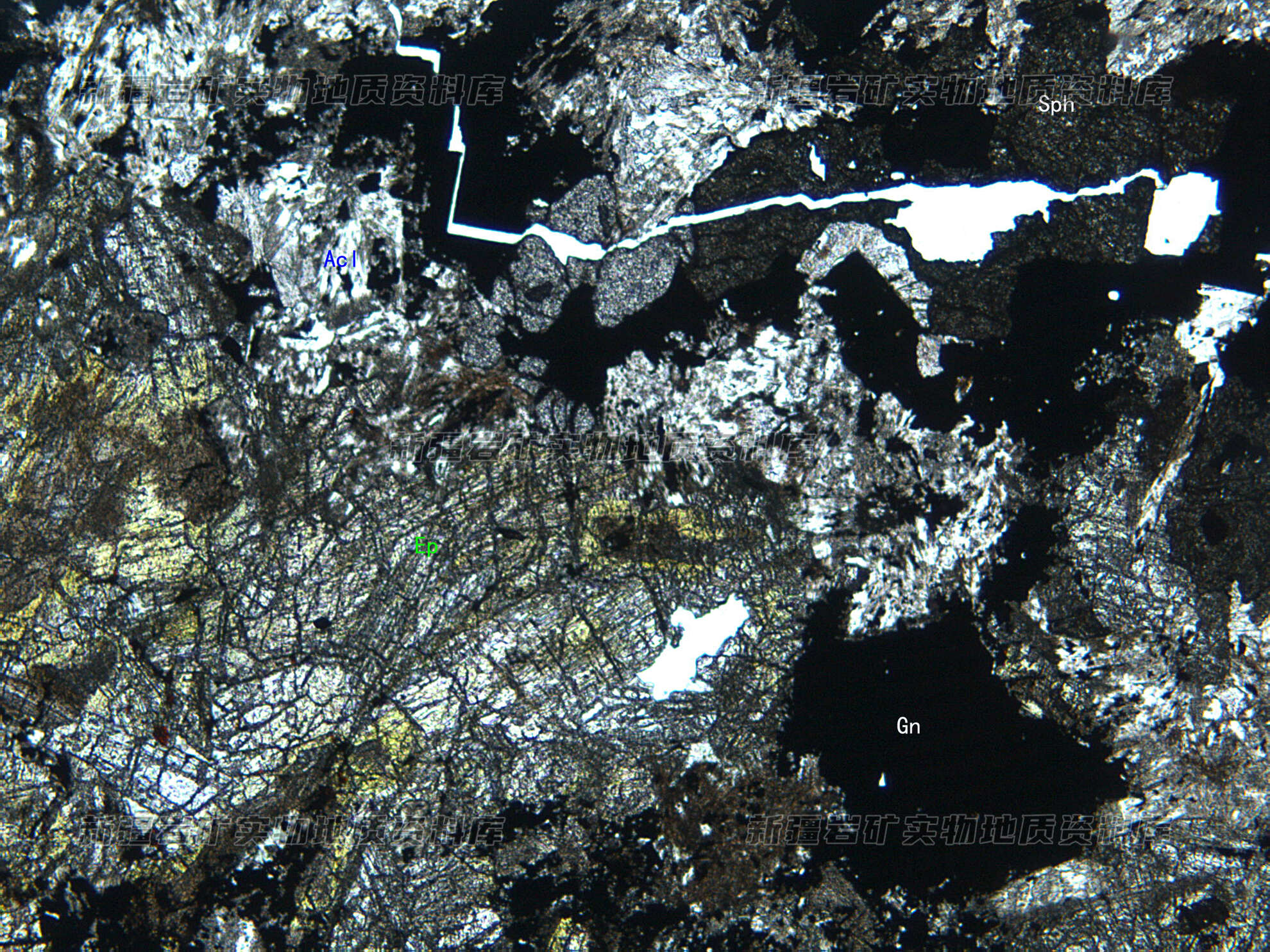 岩石由绿帘石(Ep)构成,并叠加与铅锌矿化有关的次生蚀变硅化、阳起石(Acl)化和碳酸盐化等,金属硫化物为方铅矿(Gn)和闪锌矿(Sph)。