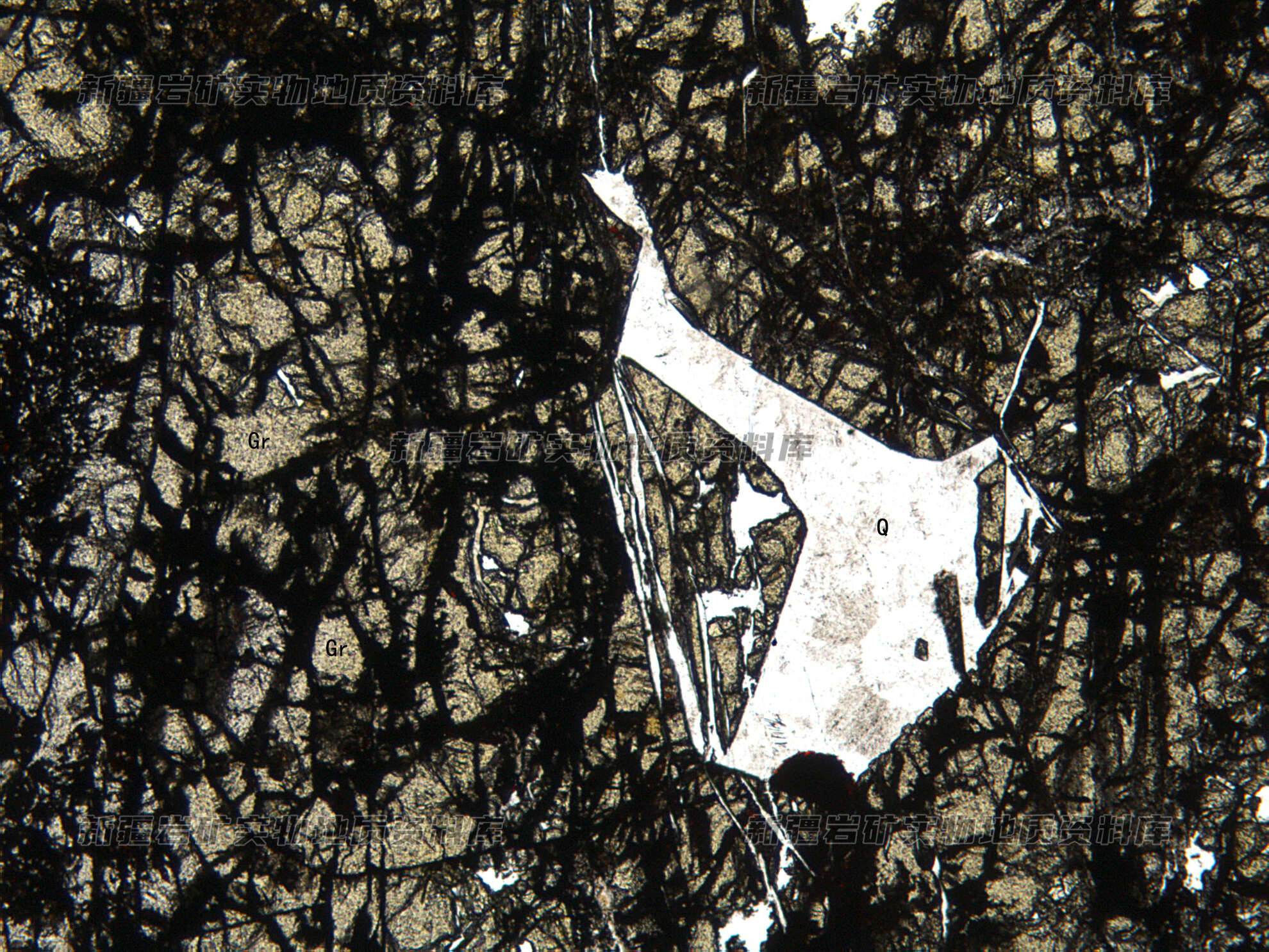 岩石特征描述: 岩石主要由石榴石(Gr)构成,其粒间分布一些石英(Q)和碳酸盐。