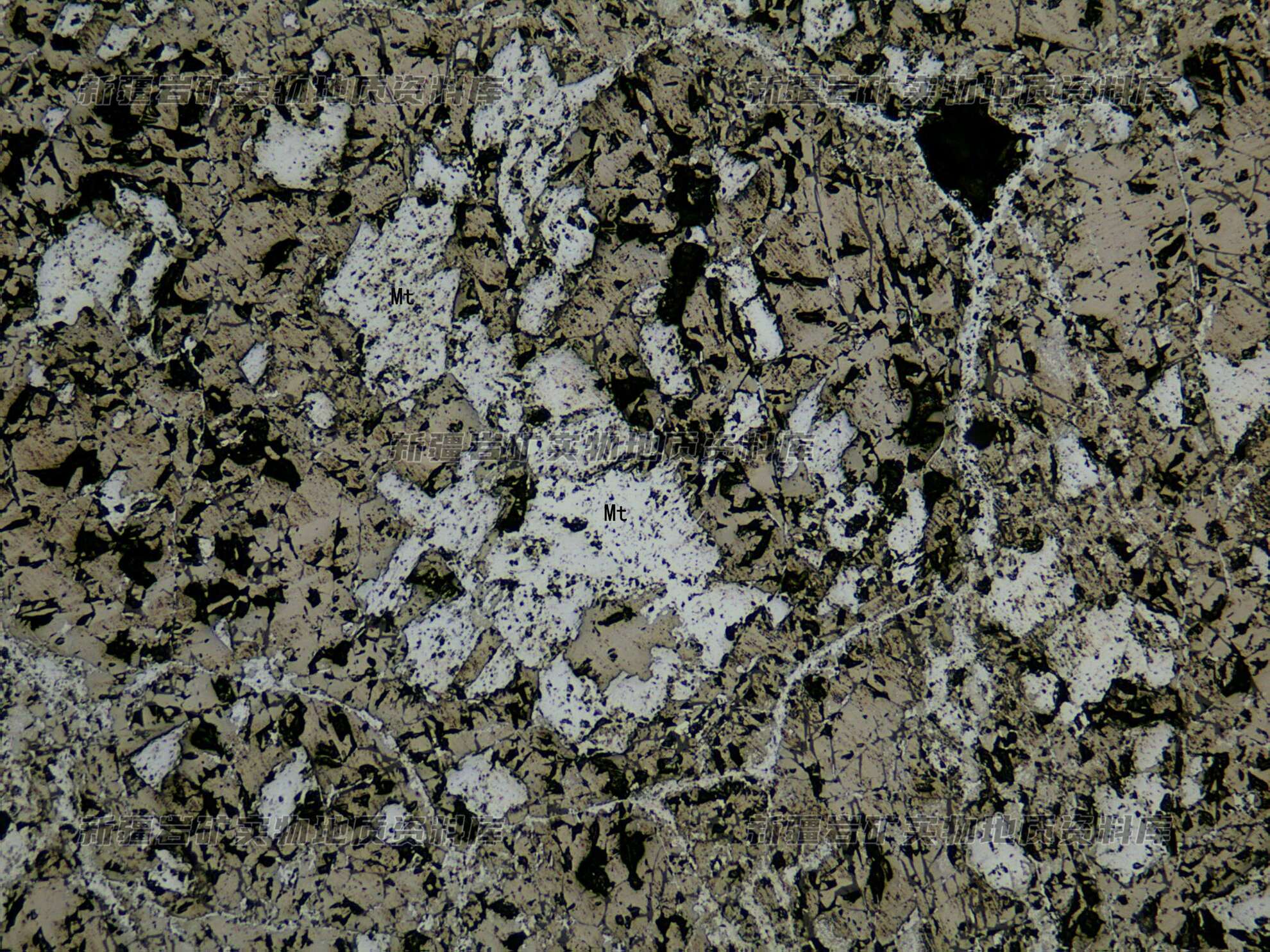 光片中全由金属矿物组成,没有观察到透明矿物,由赤铁矿、磁铁矿组成。