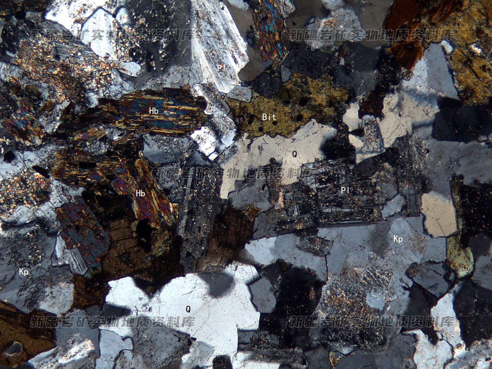 岩石特征描述: 岩石由钾长石(Kp)、斜长石(Pl)、普通角闪石(Hb),黑云母(Bit)及石英(Q)等构成。