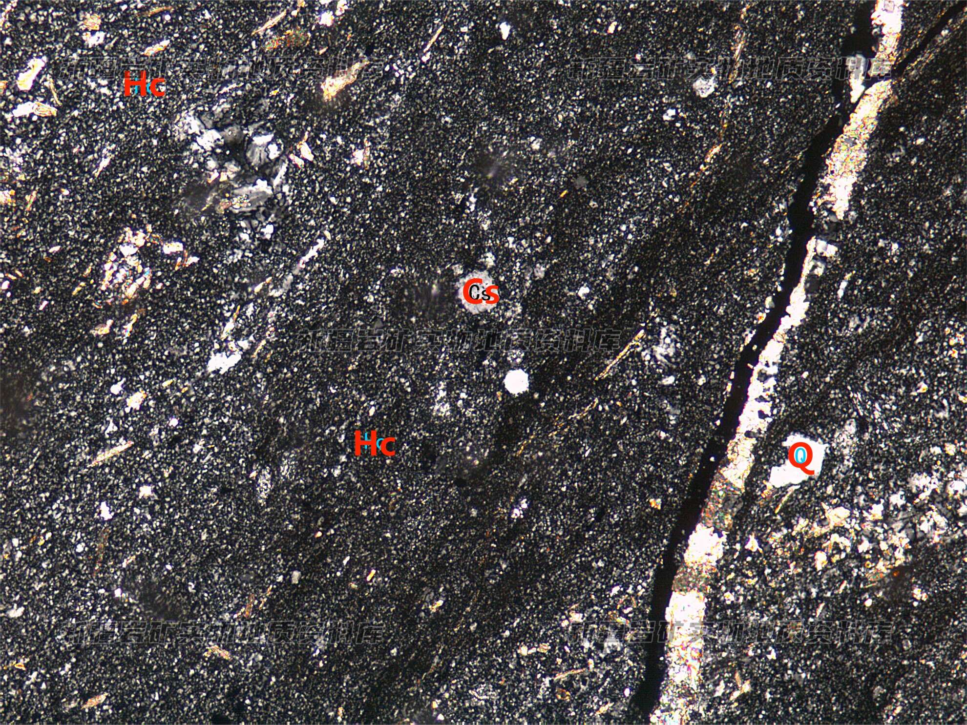 岩石由长石(Cs)、石英(Q)碎屑和火山灰尘(Hc)物质构成。晶屑含量较少,多数已蚀变成长英质矿物、方解石集合体的火山灰尘。