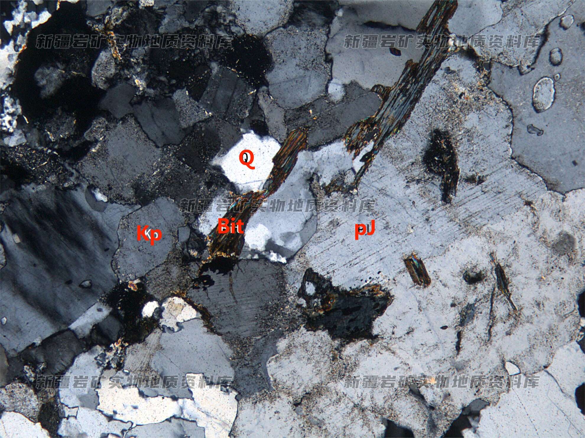 岩石由斜长石(Pl)、钾长石(Kp)、石英(Q)及黑云母(Bit)组成。形态呈他形—半自形粒状分布,黑云母已蚀变为绿泥石。