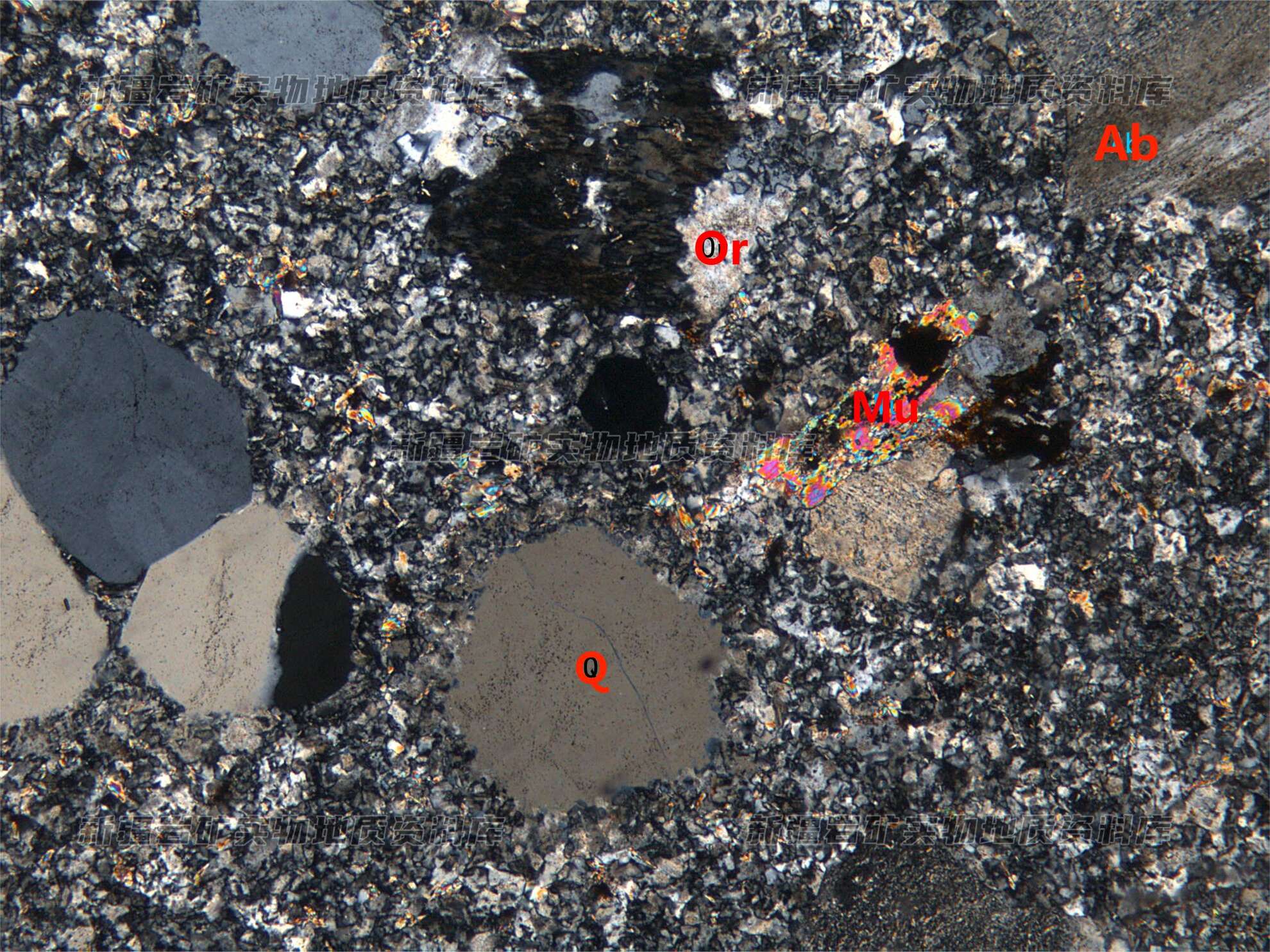 斑晶为钠长石(Ab)、正长石(Or)、石英(Q)和少量的白云母(Mu),呈半自形粒状分布,基质由微晶状钾长石、石英等组成。