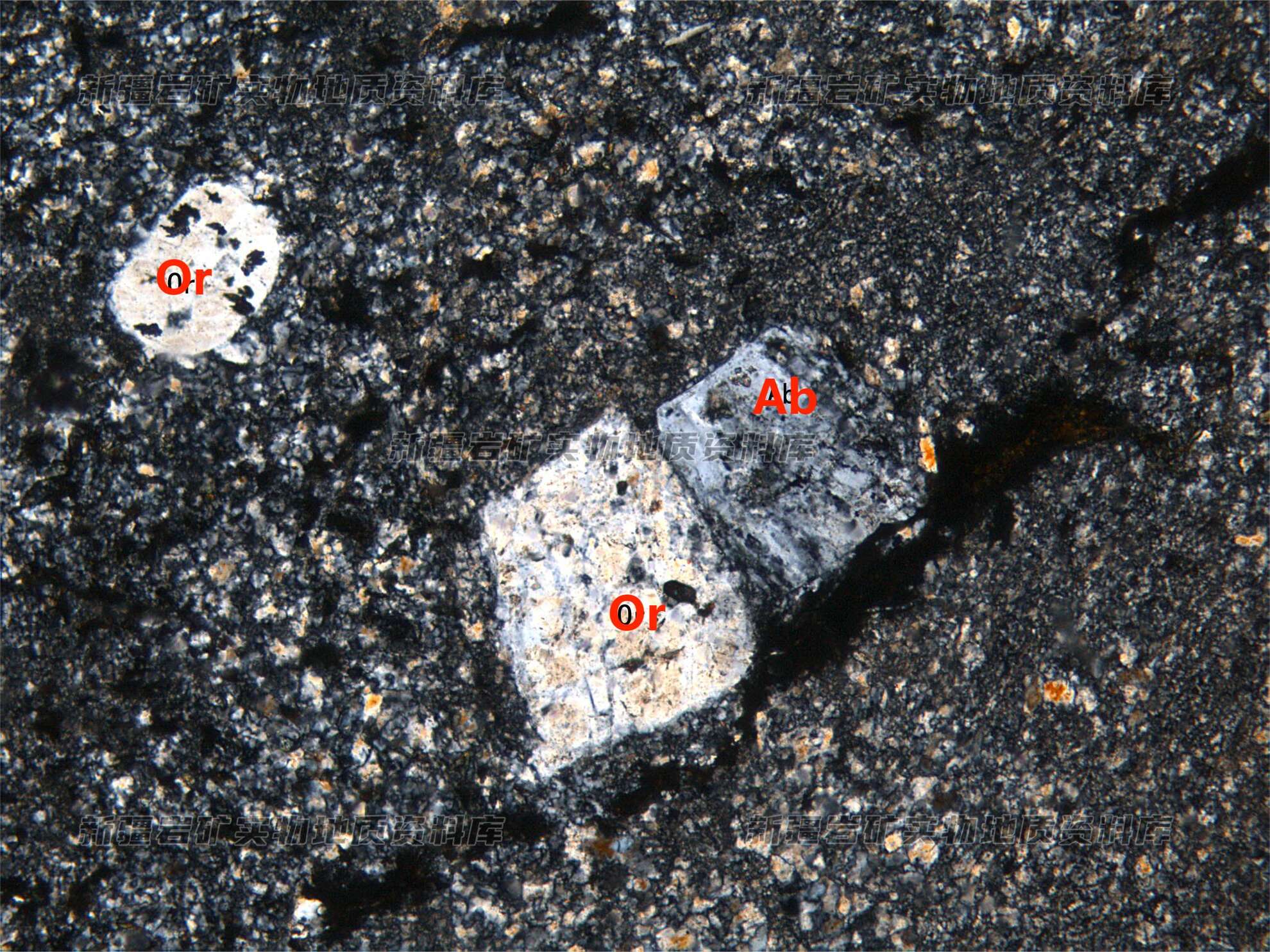 斑晶为钠长石(Ab)、正长石(Or),呈半自形粒状,基质由细粒长英质矿物构成。