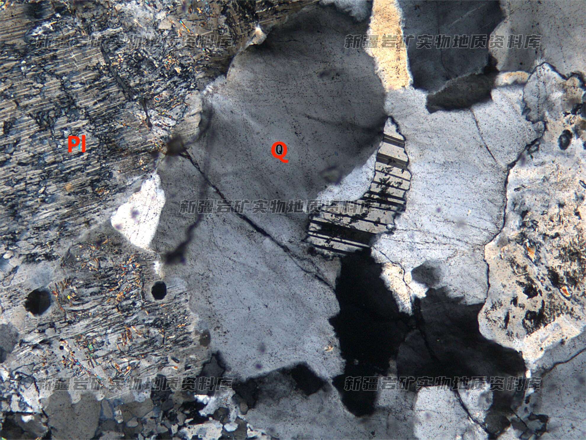 岩石由斜长石(Pl)、石英(Q)构成,斜长石呈半自形粒状,被黝帘石和绢云母交代,石英呈他形粒状与长石连生在一起。