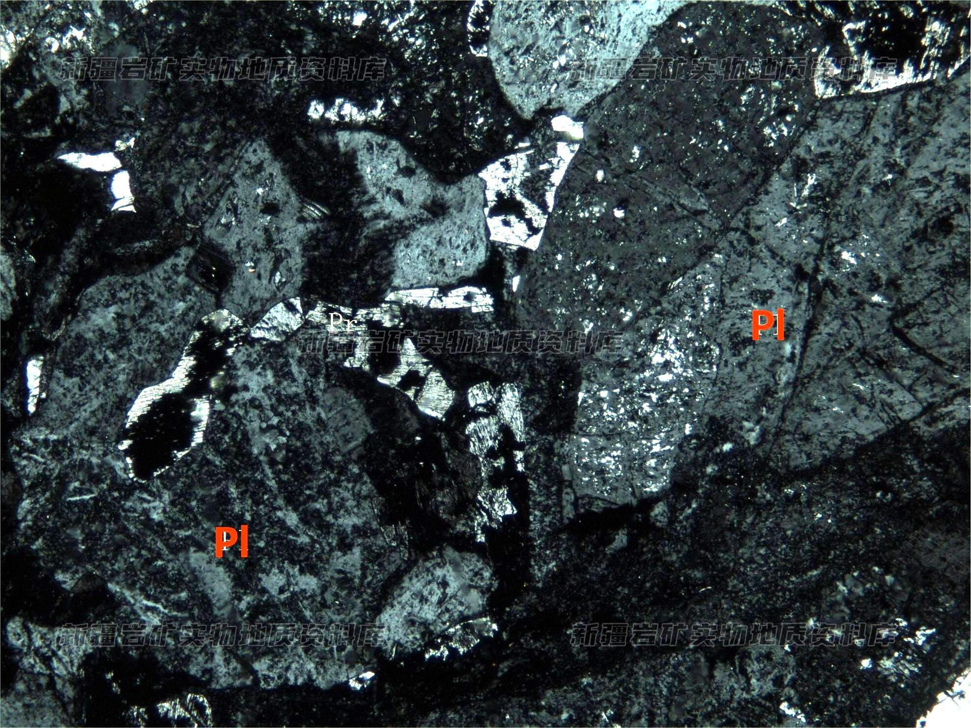 岩石特征描述: 岩石由普通辉石(Pr)和斜长石(Pl)两种矿物构成,长石被葡萄石等矿物交代。