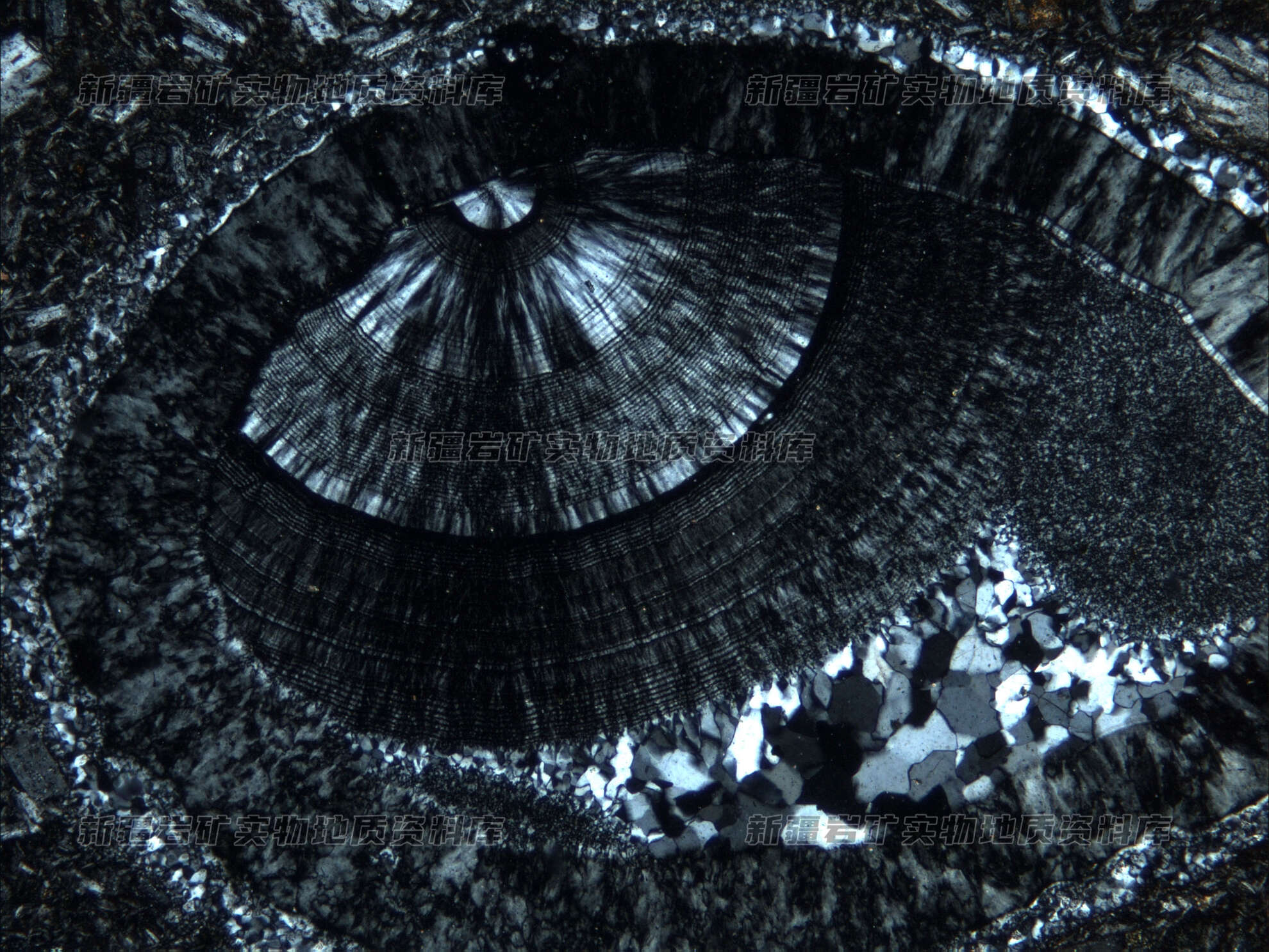 岩石特征描述: 火山岩中的气孔被次生石英和纤维状玉髓充填,呈扇形分布。岩石中斑晶粒度细小,主要由斜长石构成,呈板条状,与基质中斜长石微晶差别不大,但它们分为大小不等两群。