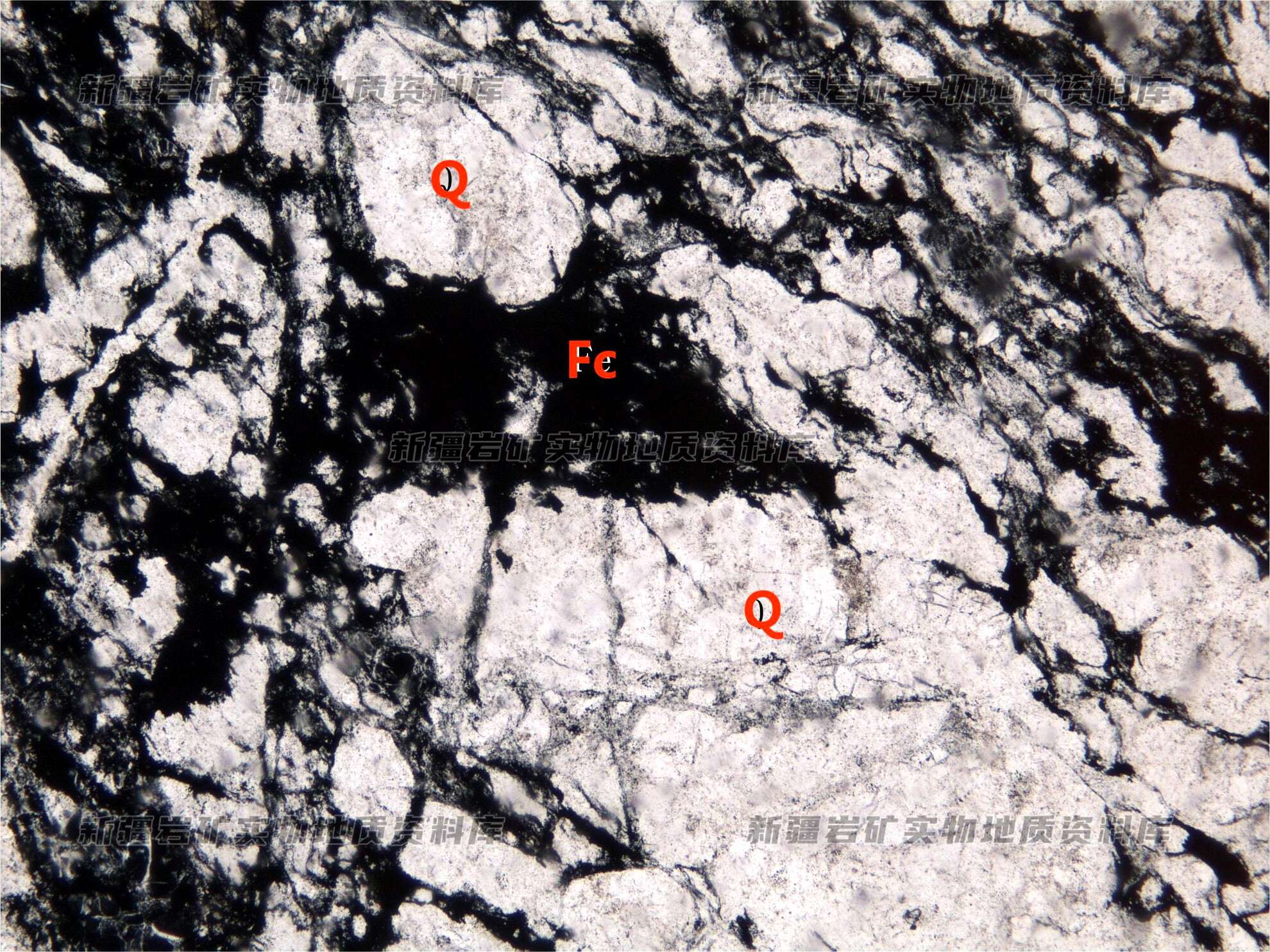 岩石特征描述: 岩石由微晶—隐晶质石英(Q)、纤维状玉髓集合体构成,局部有重结现象。受应力活动影响,岩石有明显的压碎,沿裂隙分布有铁质(Fe)。
