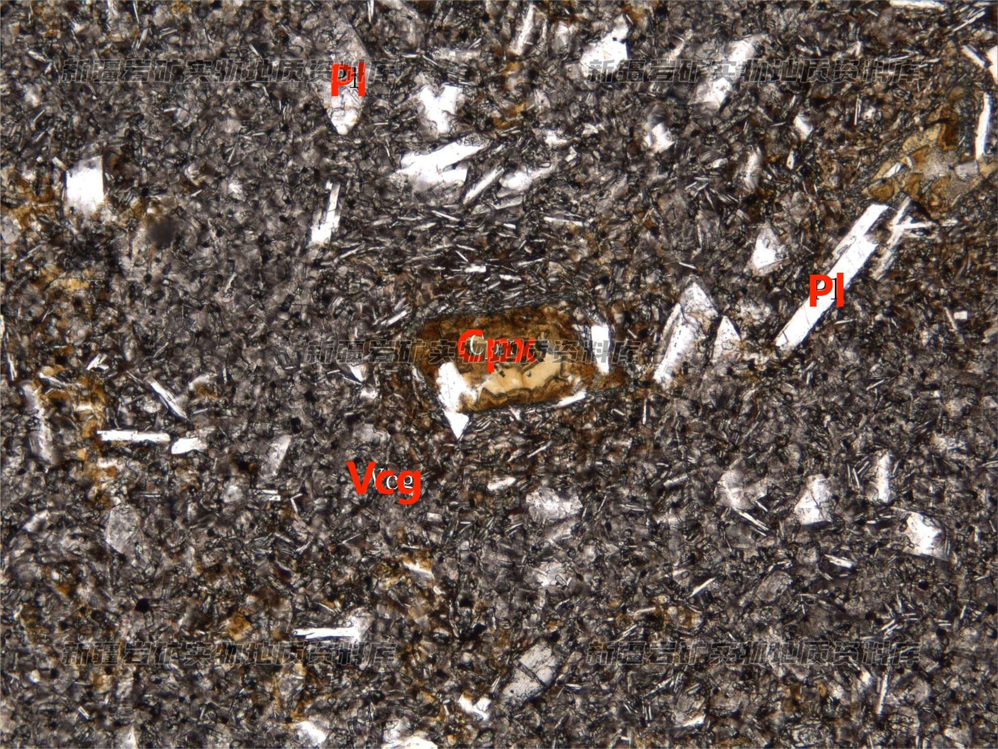 岩石特征描述: 由斜方辉石(Cpx)、斜长石(Pl)斑晶和基质两部分构成,斑晶呈半自形粒状分布,辉石被禄泥石取代。