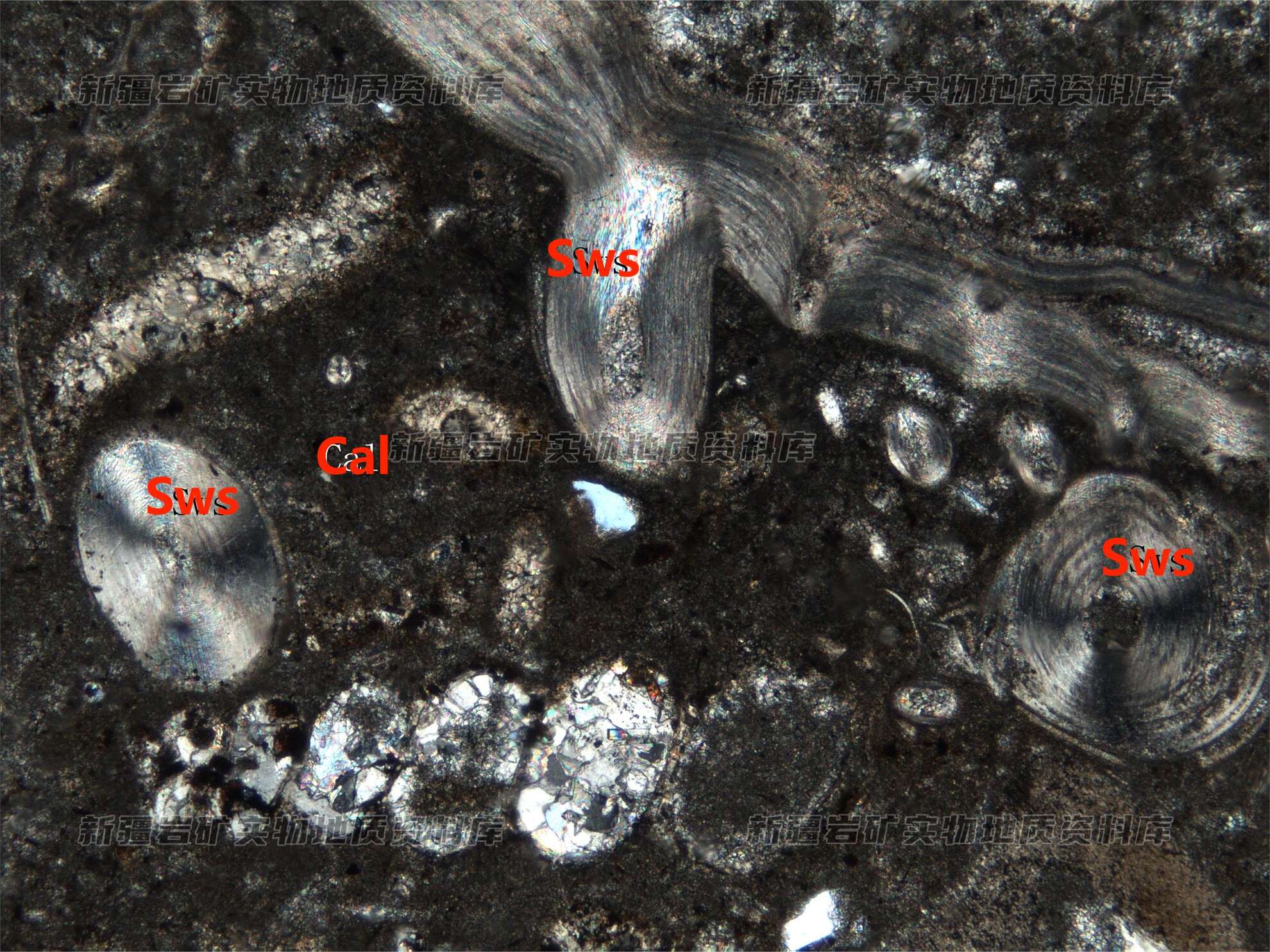 岩石特征描述: 岩石由生物碎屑(Sws)和胶结物微晶方解石(Cal)构成,生物碎屑为有孔虫、腕足等。方解石呈微晶状分布在碎屑之间。