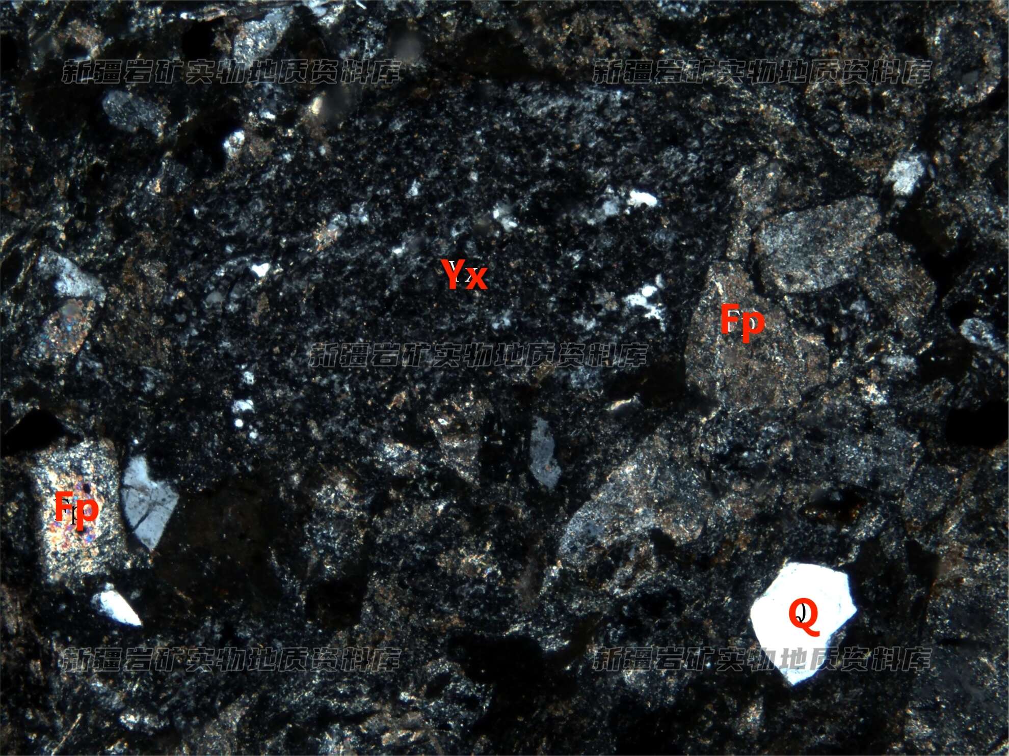 岩石特征描述: 岩石由长石(Fp)石英(Q)碎屑、岩屑(Yx)及胶结物构成,长石被次生绢云母、方解石交待,胶结物为泥质物。岩石中碎屑的粒度大小不等,分选较差,相互混杂。碎屑呈次圆状、次角状、角状,磨圆中等。碎屑成分岩屑80-85%,长石20-15%,石英,少,铁矿屑1%。