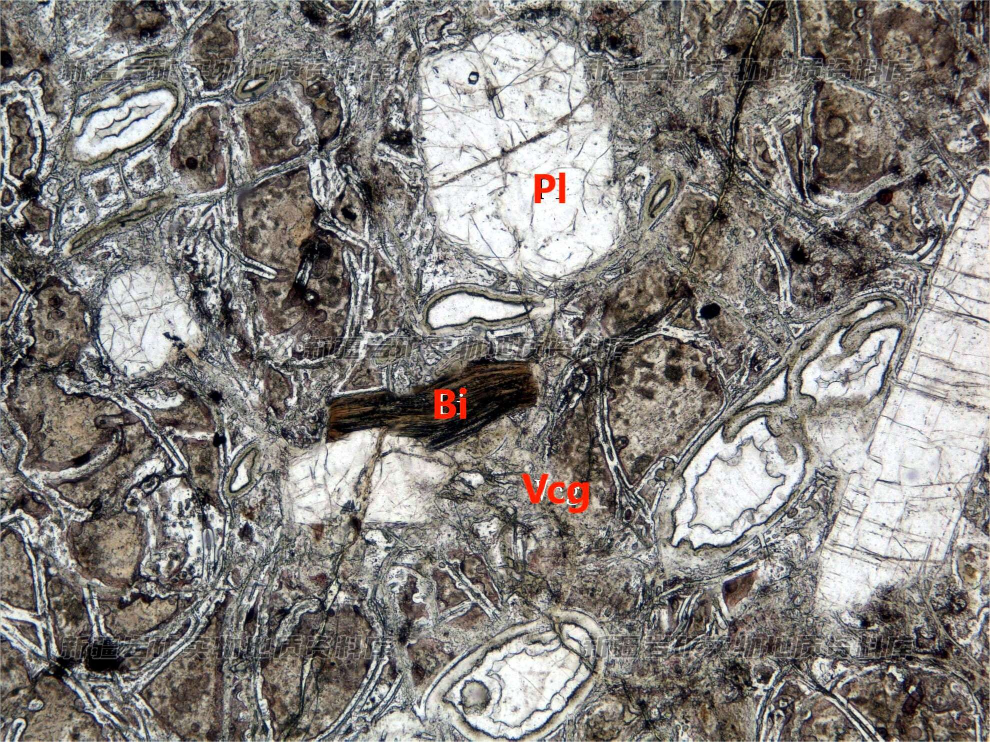 岩石特征描述: 岩石具珍珠状构造,斑晶为斜长石(Pl)和黑云母(Bi),含量较低,呈半自形粒状分布。火山玻璃(Vcg)因冷却收缩形成珍珠状裂纹。
