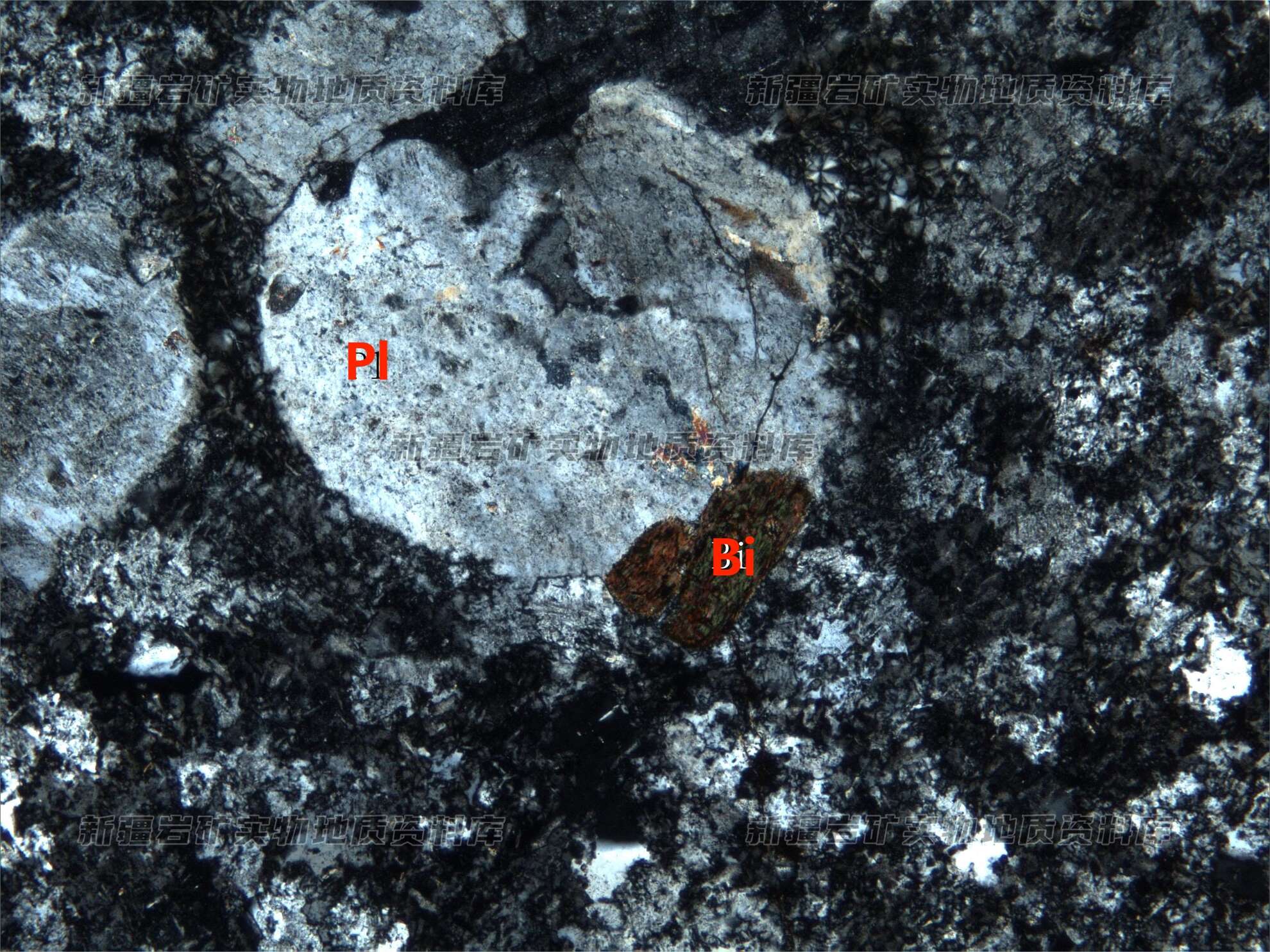 岩石特征描述: 斑晶为斜长石(Pl)和黑云母(Bi),呈半自形粒状分布。基质中的球粒包含结构由石英作为主晶,长石与其崁布连生而成。