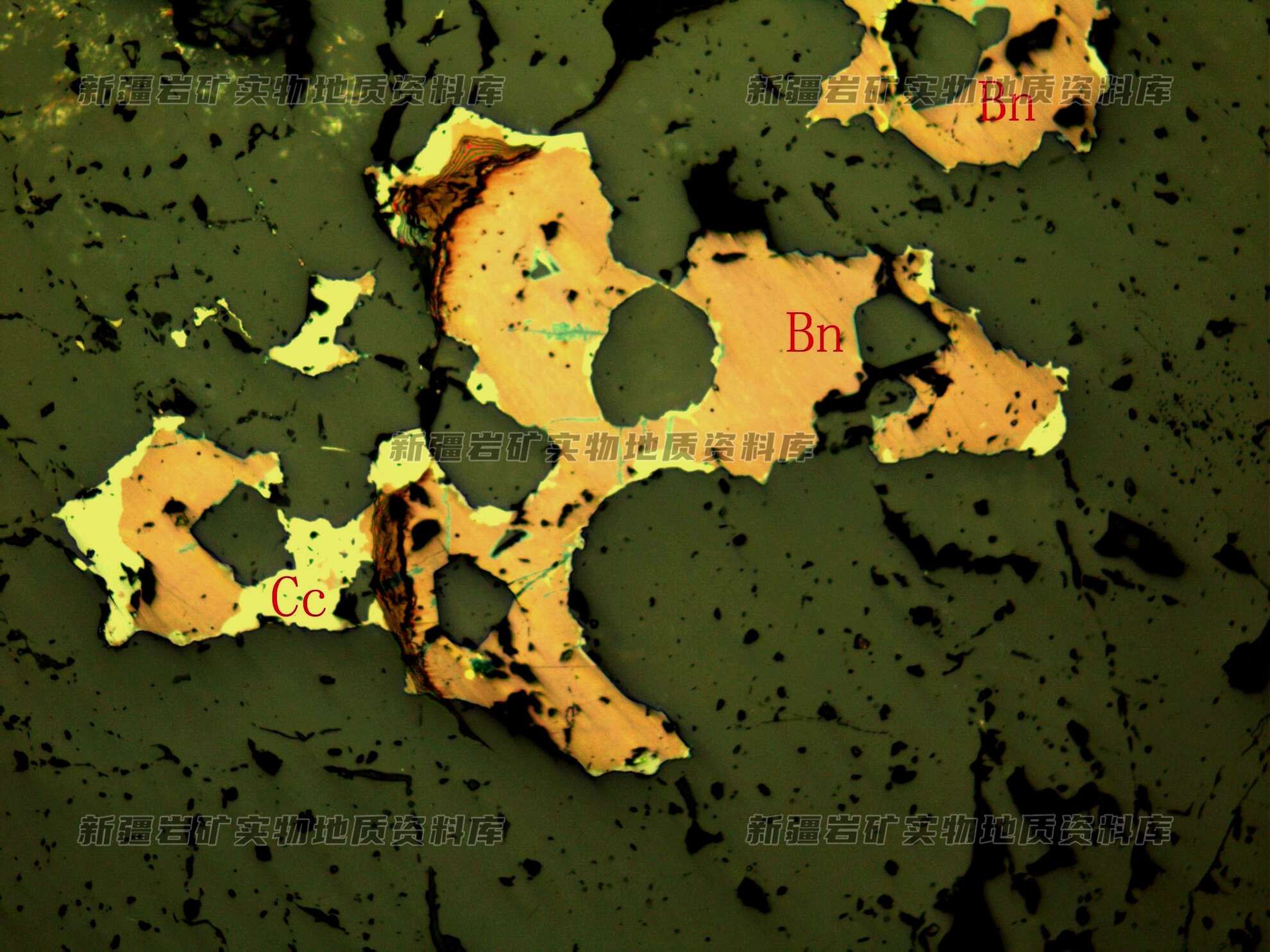 岩石中金属矿物有黄铜矿、斑铜矿、辉铜矿、铜蓝、磁铁矿等组成,黄铜矿他形粒状,大小0.05-1mm,呈星点浸染状和细脉浸染状分布石榴石的粒间。斑铜矿他形粒状同黄铜矿连生在一起,在斑铜矿中也有固溶分解的黄铜矿,0.01×0.03mm,斑铜矿边缘被粒状辉铜矿交代,0.05-0.1mm,铜蓝细小叶片状沿斑铜矿边缘交代。