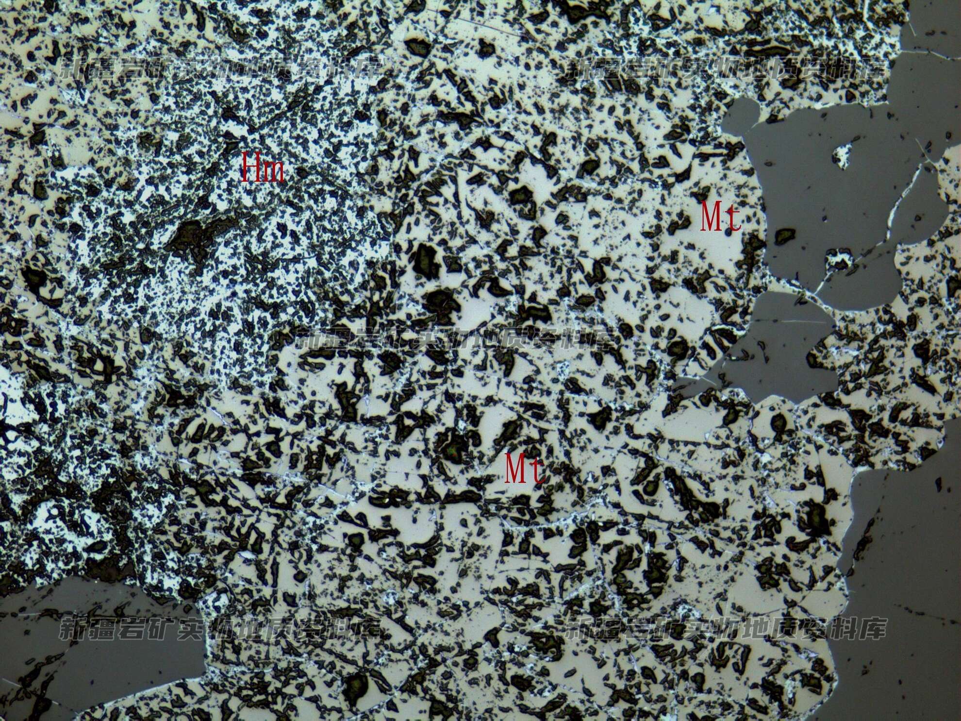 岩石特征描述: 矿石多数由磁铁矿(Mt)构成,次生赤铁矿(Hm)沿边缘或裂隙交代磁铁矿,粒间充填脉石矿物。
