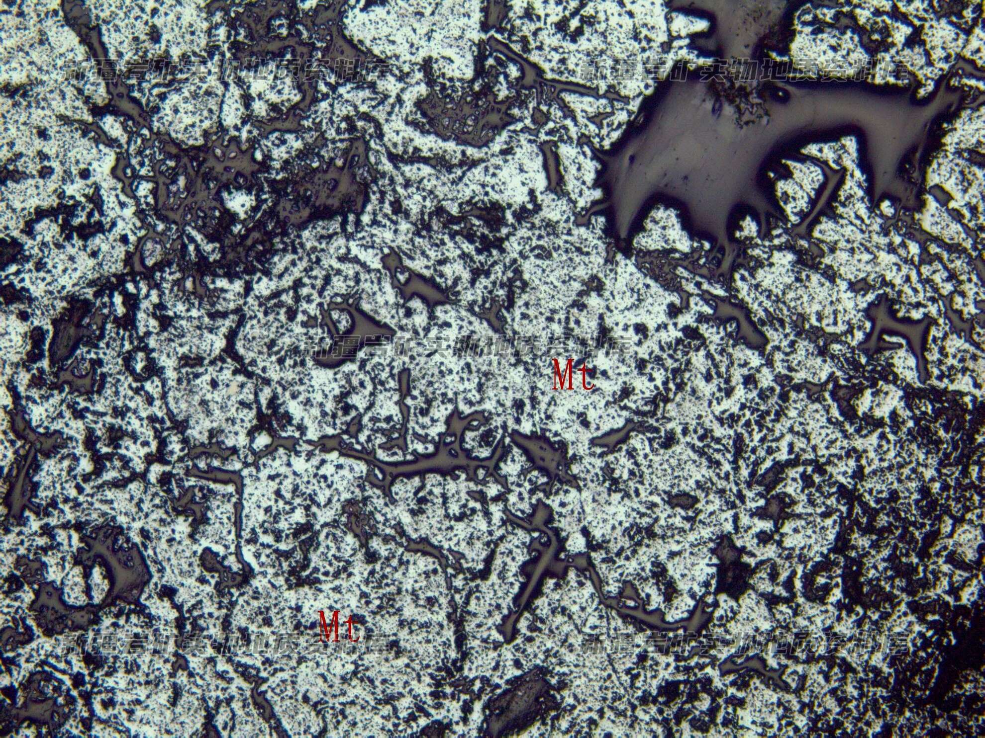 磁铁矿半自形粒状集合体,磁铁矿粒径0.1-0.5mm,1-2mm,磁铁矿沿边缘赤铁矿化。