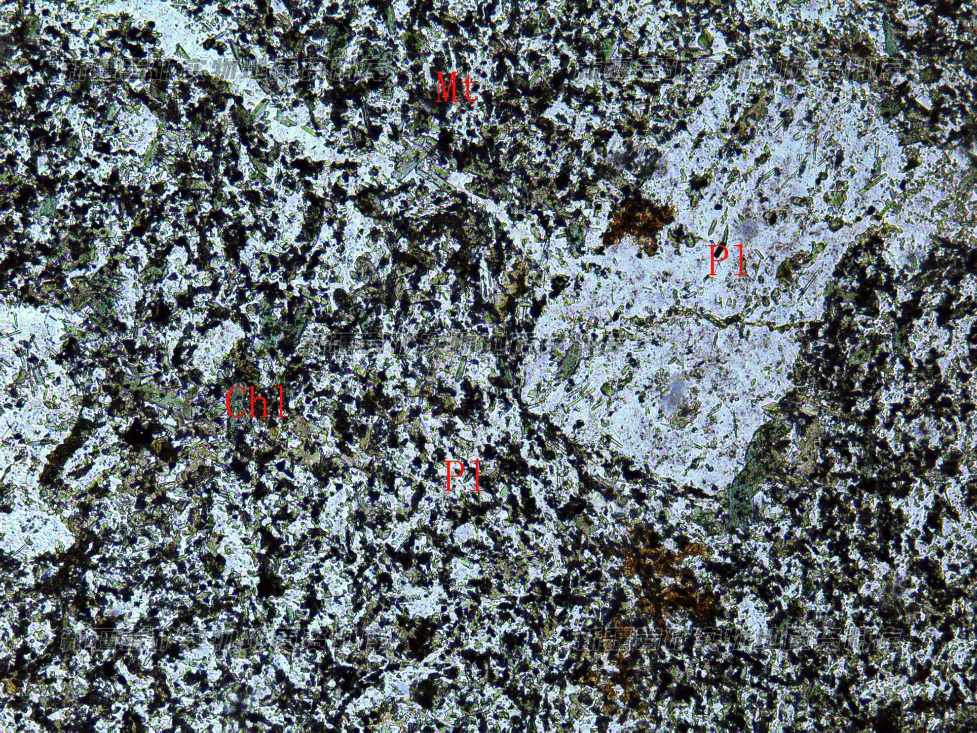 岩石特征描述: 斑晶为斜长石(Pl),基质由板条状斜长石(Pl)、细粒磁铁矿(Mt)和绿泥石(Chl)等构成。