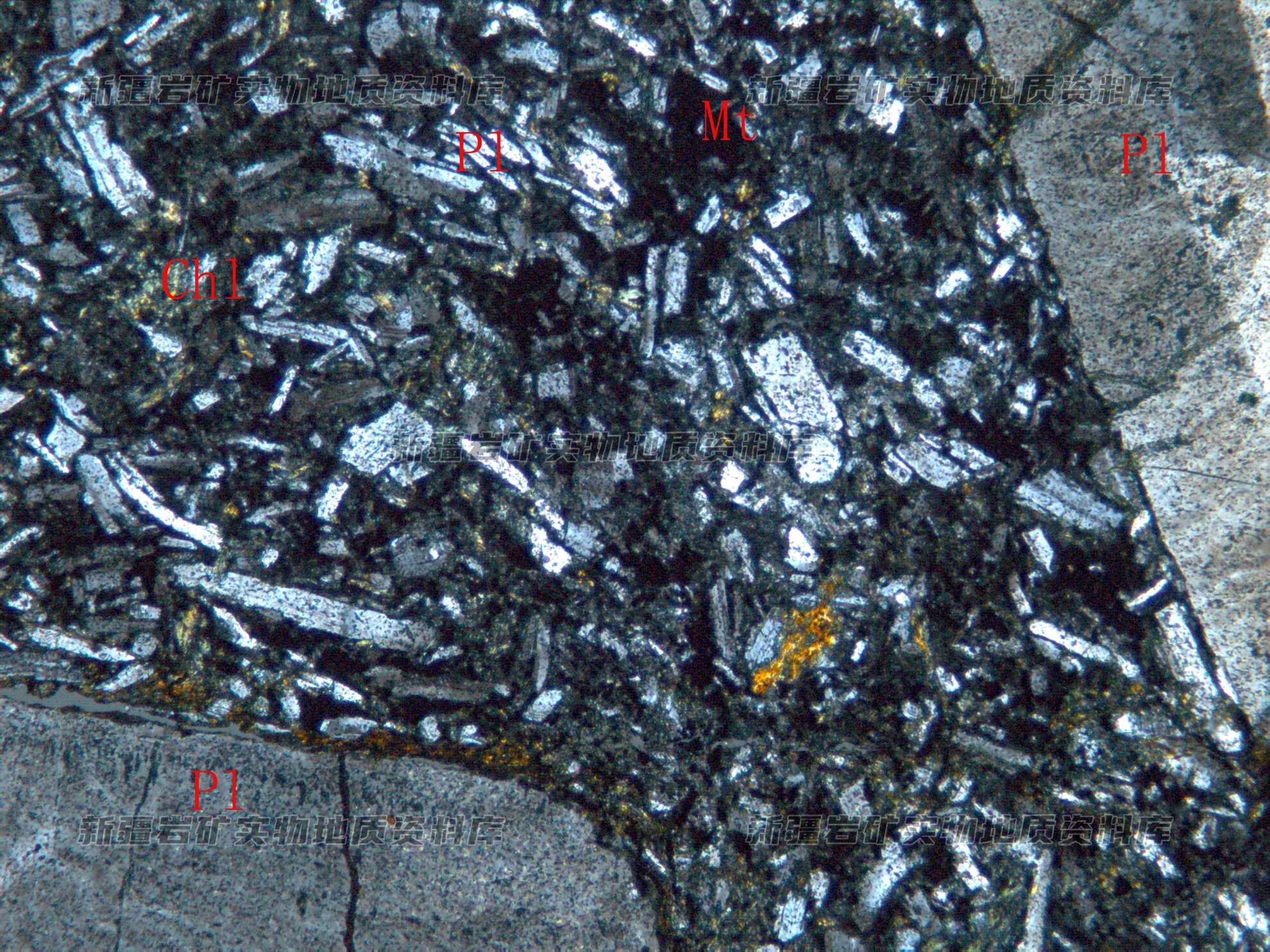 岩石特征描述: 斑晶为斜长石(Pl),基质由板条状斜长石(Pl)、细粒磁铁矿(Mt)和绿泥石(Chl)等构成。