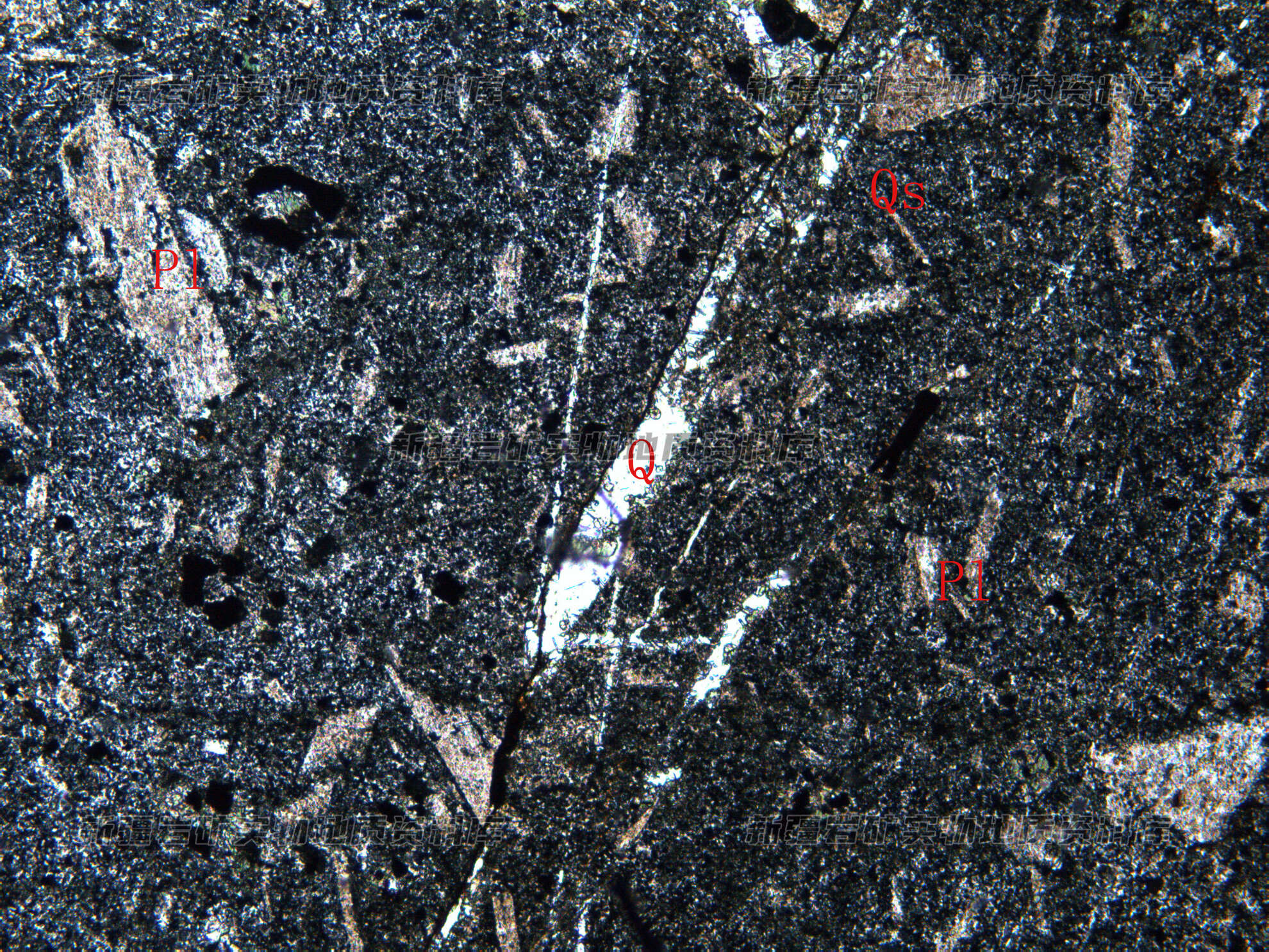 岩石特征描述: 斑晶为斜长石(Pl),被绢云母交代。基质由板条状微晶斜长石(Pl)、细粒磁铁矿(Mt)、纤闪石(Qs)等构成,沿裂隙充填石英脉(Q)。
