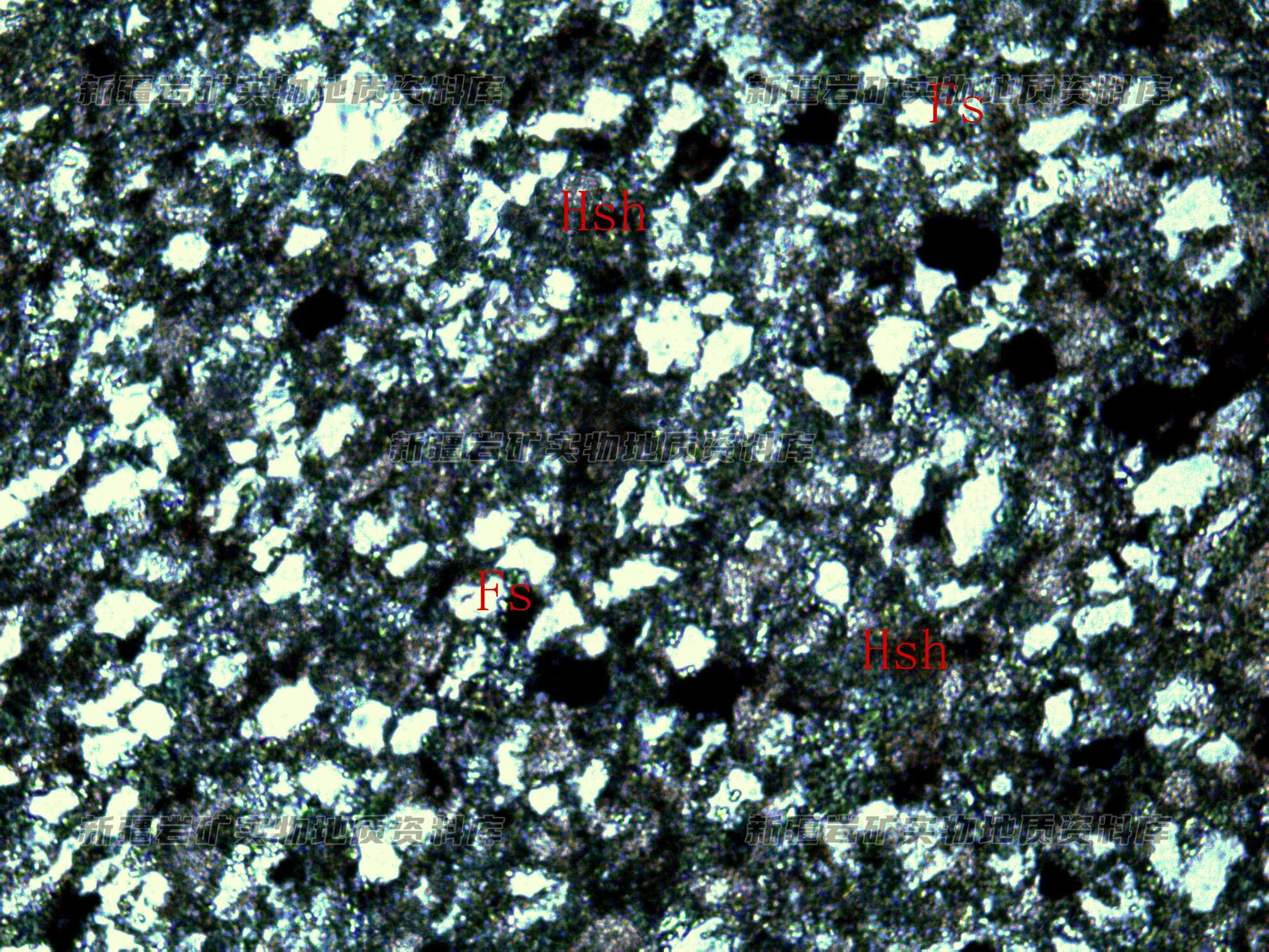 岩石特征描述: 岩石具变余砂状结构,由砂屑(Fs)、火山碎屑(Hsh)及胶结物等构成。