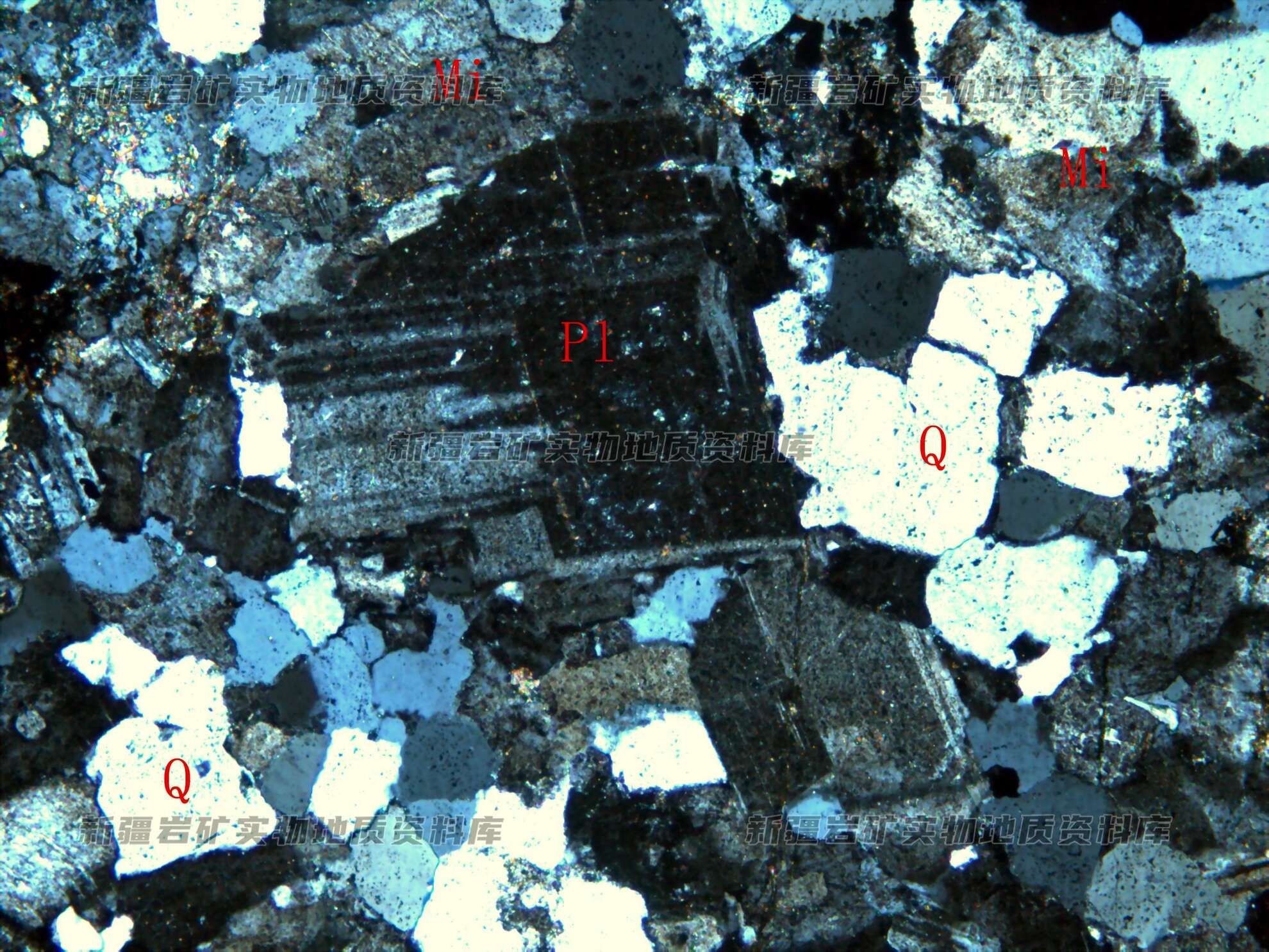 岩石特征描述: 岩石由斜长石(Pl)、钾长石(Mi)及石英(Q)等构成,矿物粒径大小相差明显。