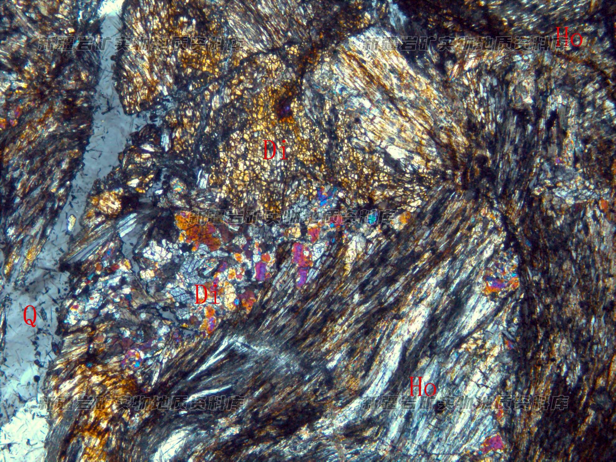 岩石特征描述: 岩石由透辉石(Di)及透闪石(Ho)等构成,沿裂隙充填石(Q)脉。
