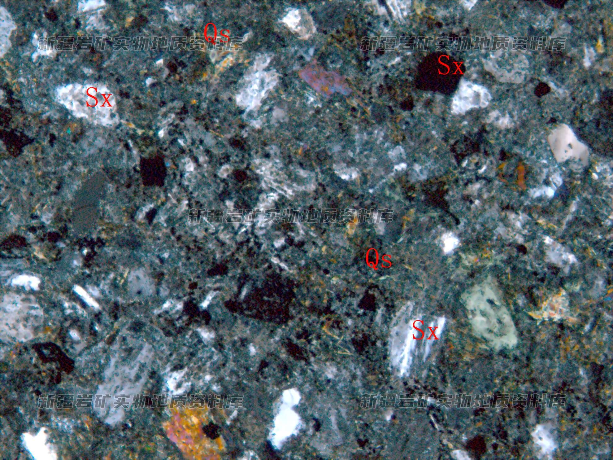 岩石特征描述: 岩石由不同粒级的碎屑(Sx)、火山碎屑及胶结物等构成,胶结物为蚀变矿物纤闪石(Qs)、绿帘石等。