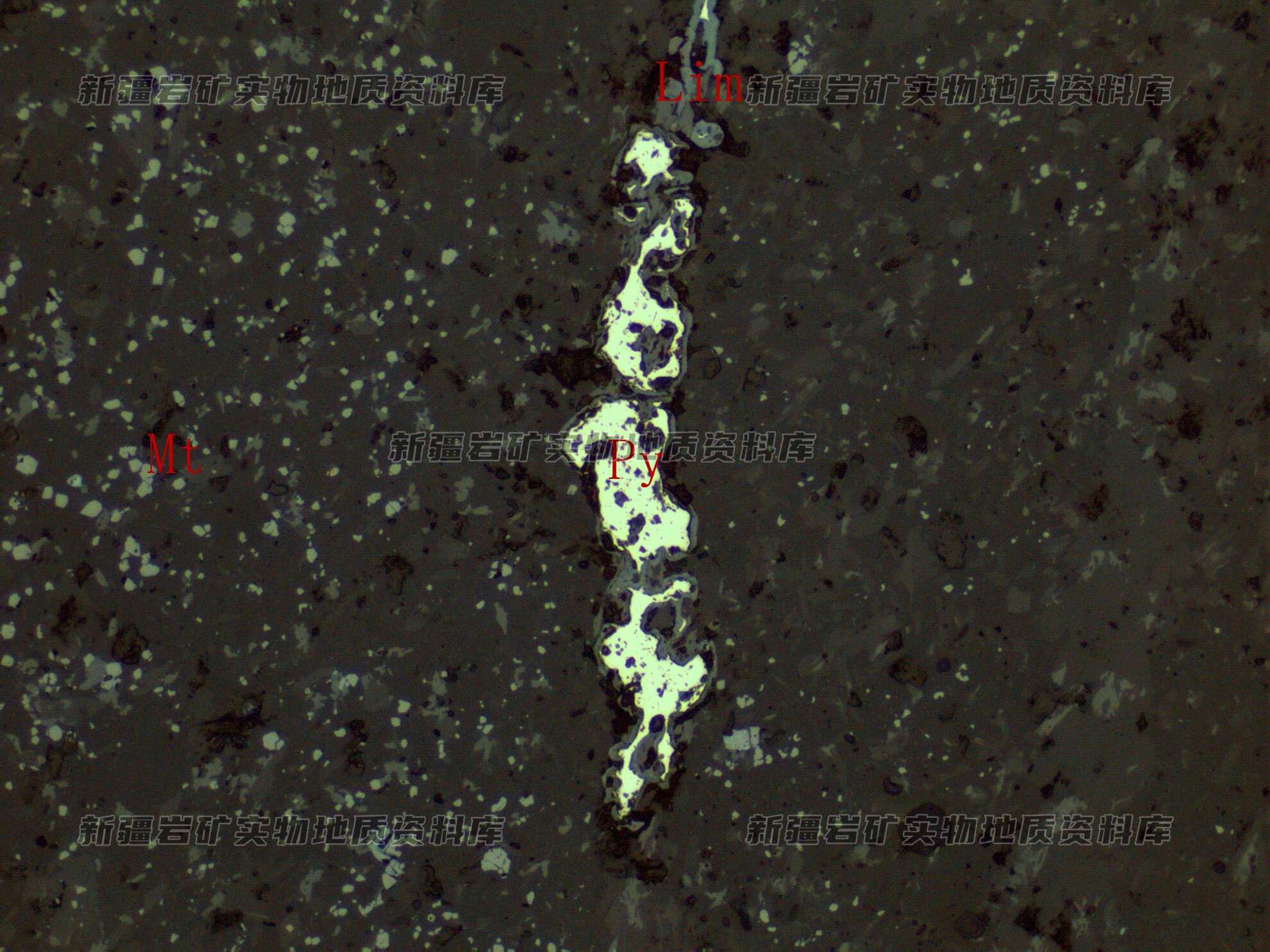 金属矿物磁铁矿(Mt)为自形—半自形粒状,呈星散状浸染分布在岩石中,沿裂隙分布黄铁矿(Py)脉,被褐铁矿(Lim)交代。
