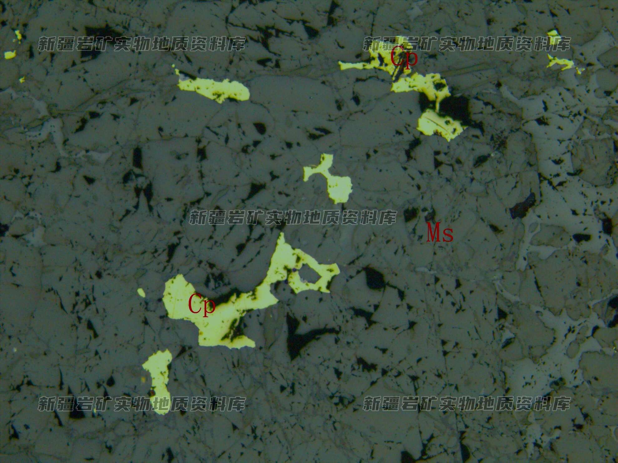 岩石特征描述: 金属硫化物黄铜矿(Cp)他形粒状呈浸染状分布在脉石矿物(Ms)之间。