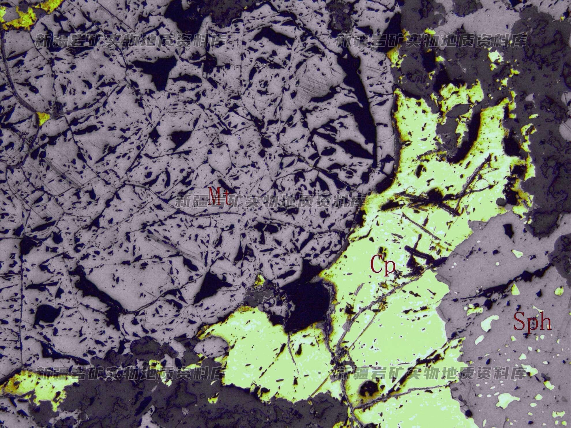 岩石特征描述: 矿石由黄铜矿(Cp)闪锌矿(Sph)和磁铁矿(Mt)构成,彼此连生在一起。