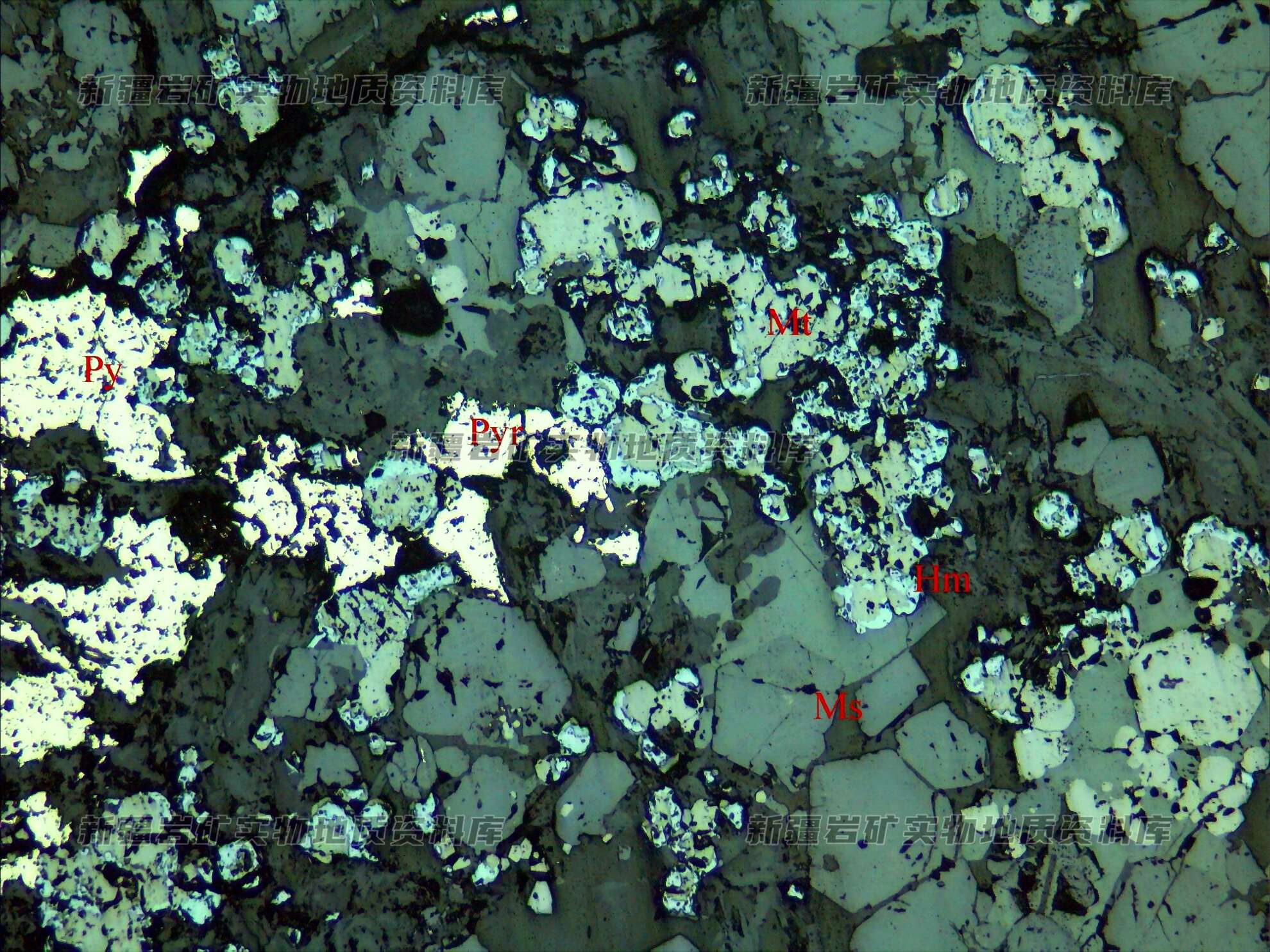 岩石特征描述: 磁铁矿(Mt)被赤铁矿(Hm)沿边缘交代,在一起共生的金属硫化物为黄铁矿,其它矿物为石榴石(Ms)。