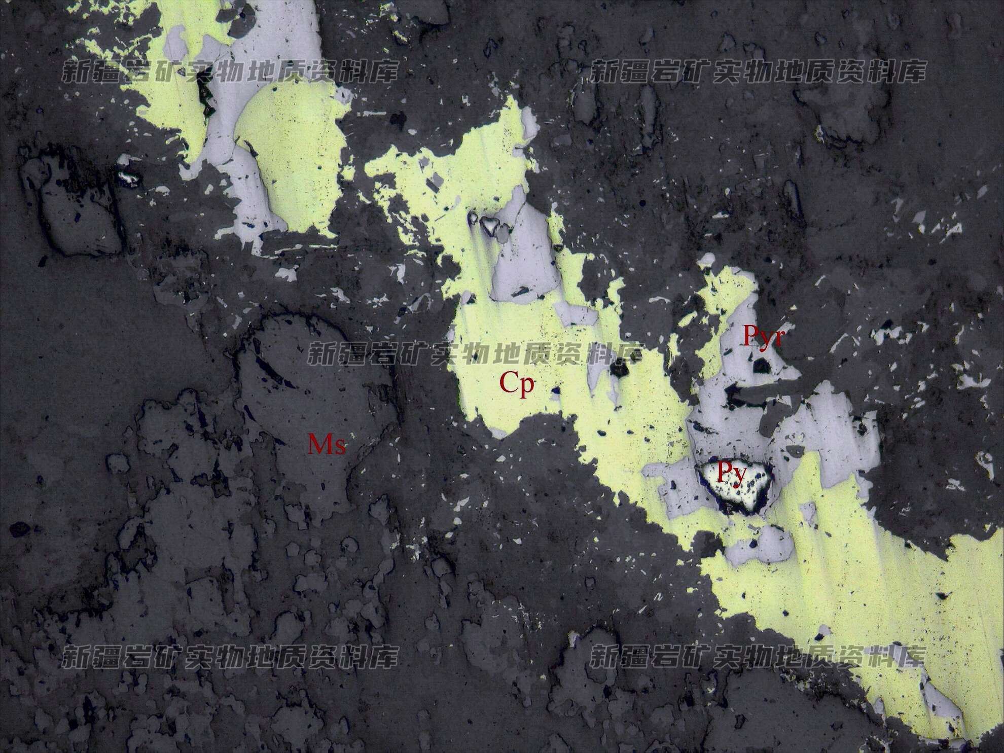 金属硫化物为黄铜矿(Cp)、磁黄铁矿(Pyr)及少量的黄铁矿(Py),磁铁矿化弱,其他为脉石矿物(Ms)。