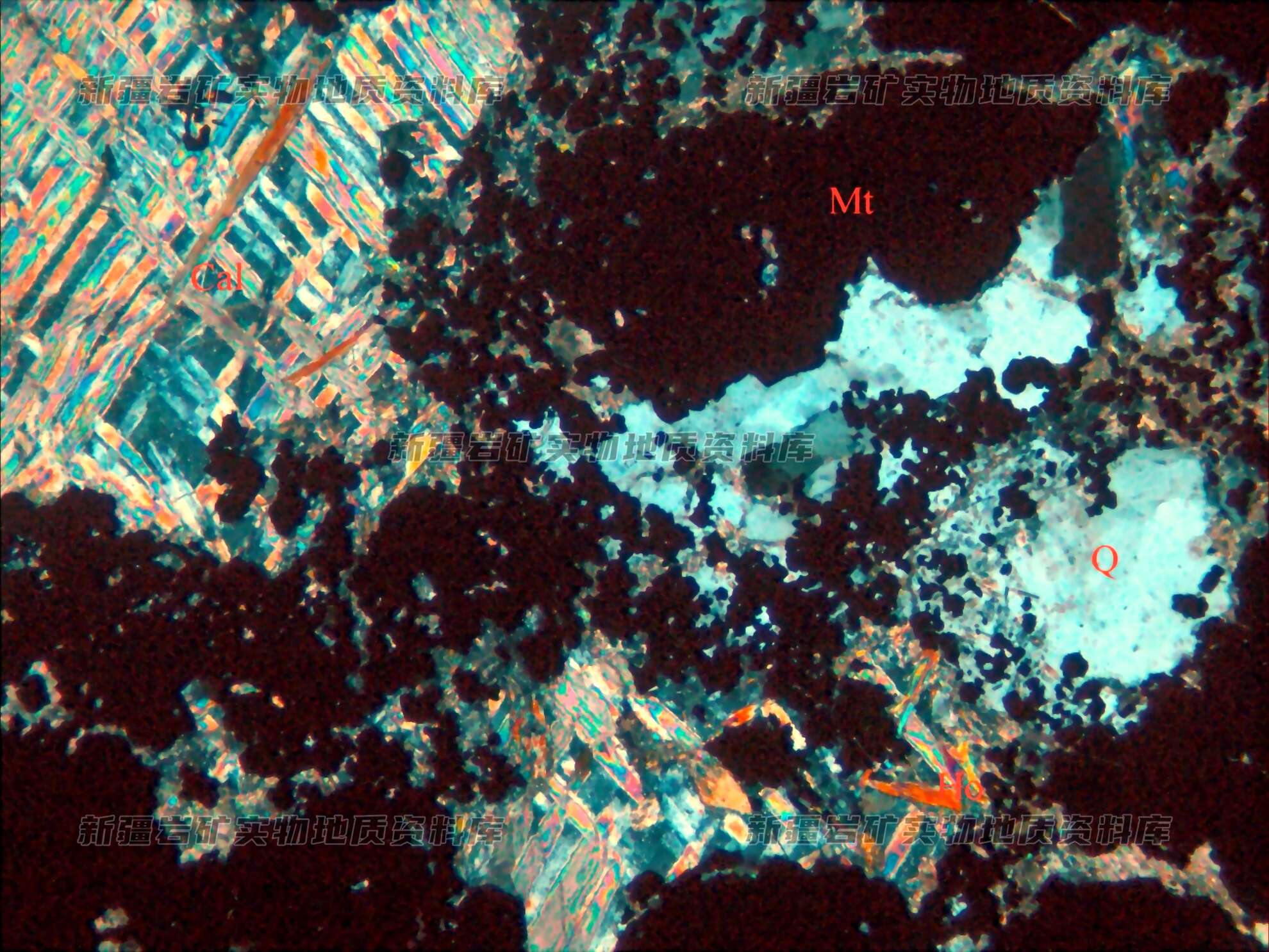 岩石特征描述: 在磁铁矿(Mt)之间分布脉石矿物透闪石(Ho)和方解石(Cal)及石英(Q)等。