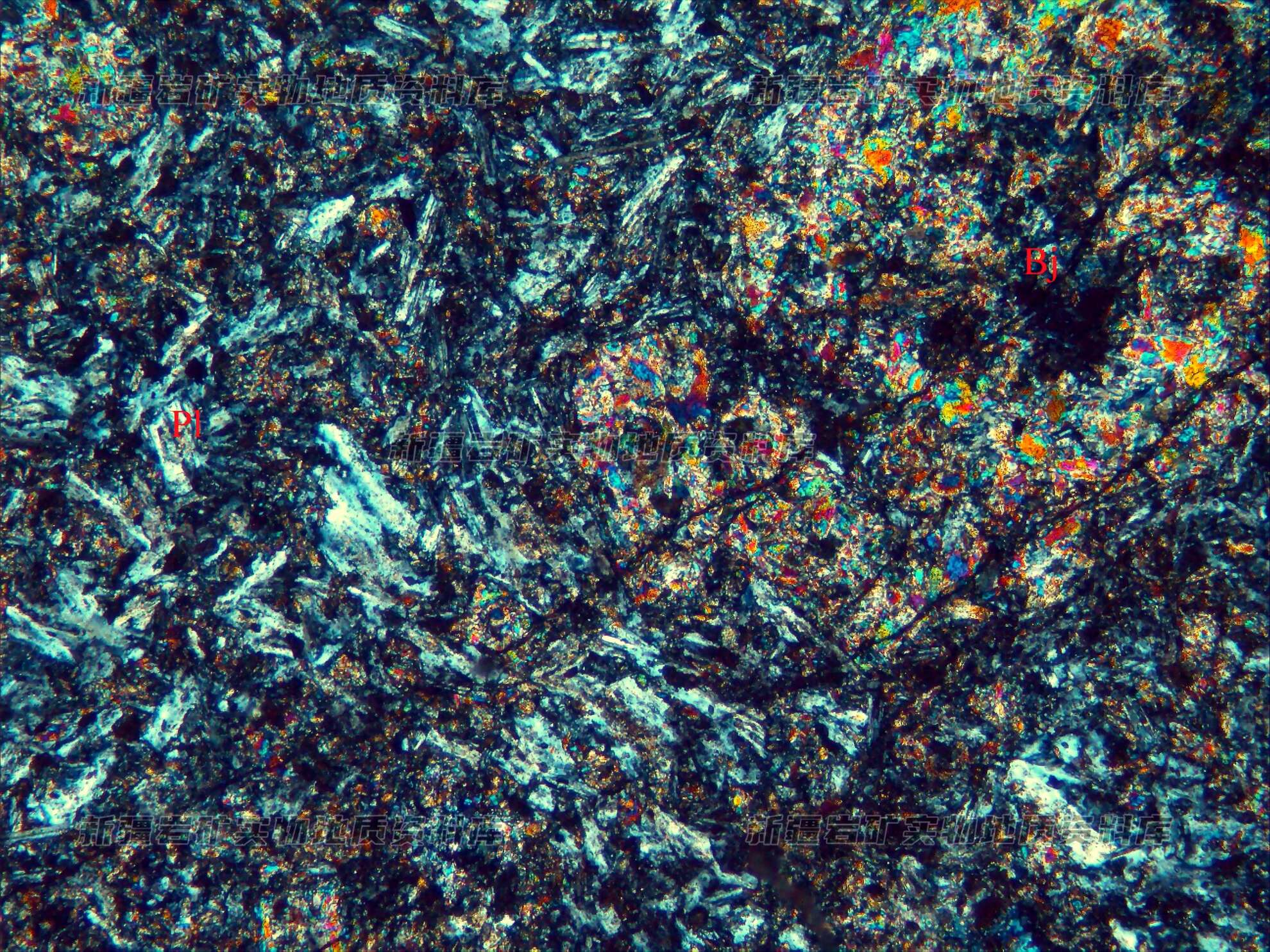 岩石特征描述: 岩石由斜长石(Pl)班晶和基质两部分构成,斜长石班晶已被次生绢云母集合体取代,基质由板条状细微晶斜长石和次生蚀变矿物构成,长石微晶呈定向分布。
