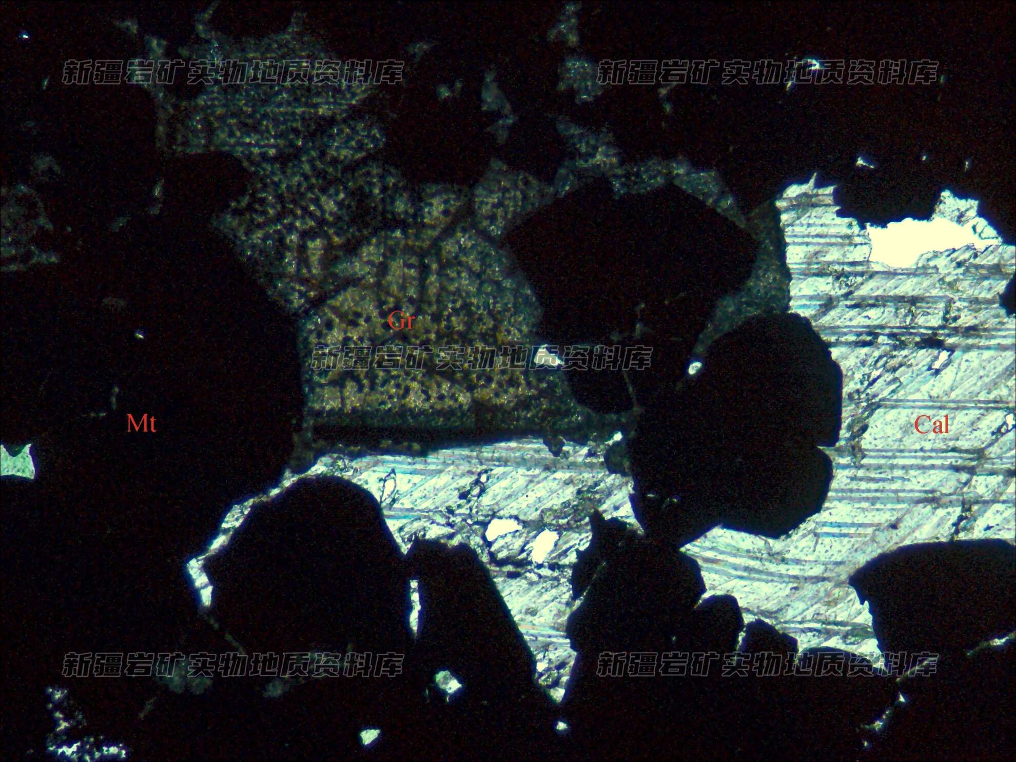 岩石特征描述: 磁铁矿(Mt)呈他形-半自形粒状分布,在其粒间充填石榴石(Gr)和方解石(Cal),石榴石形成要早于方解石。