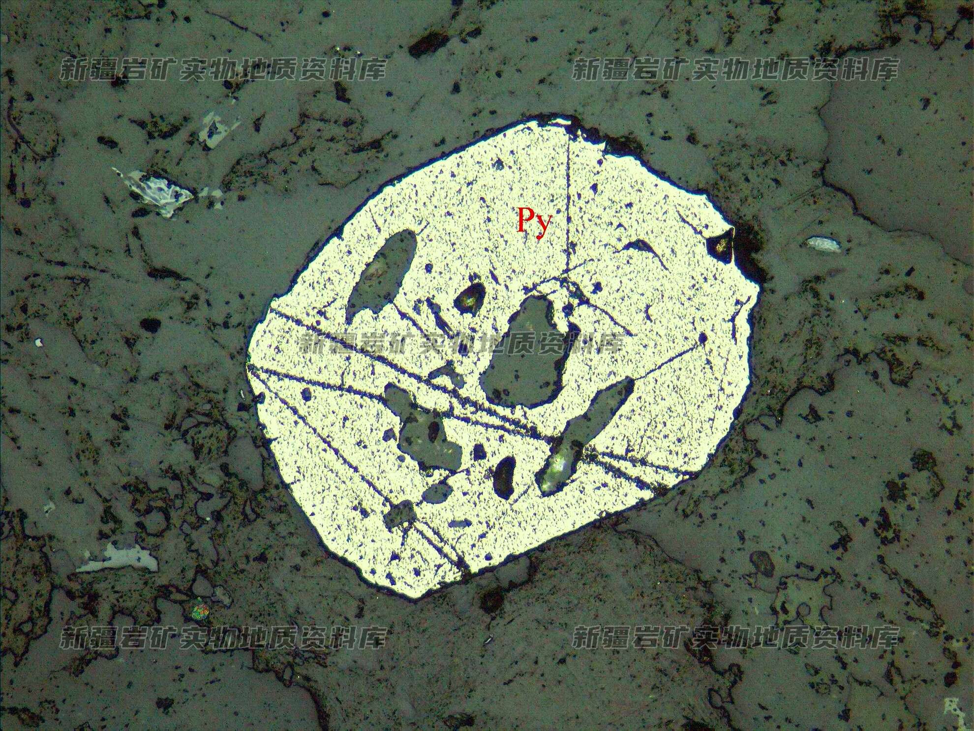 岩石特征描述: 金属硫化物黄铁矿(Py)半自形粒状,分布在脉石矿物(Ms)之间。