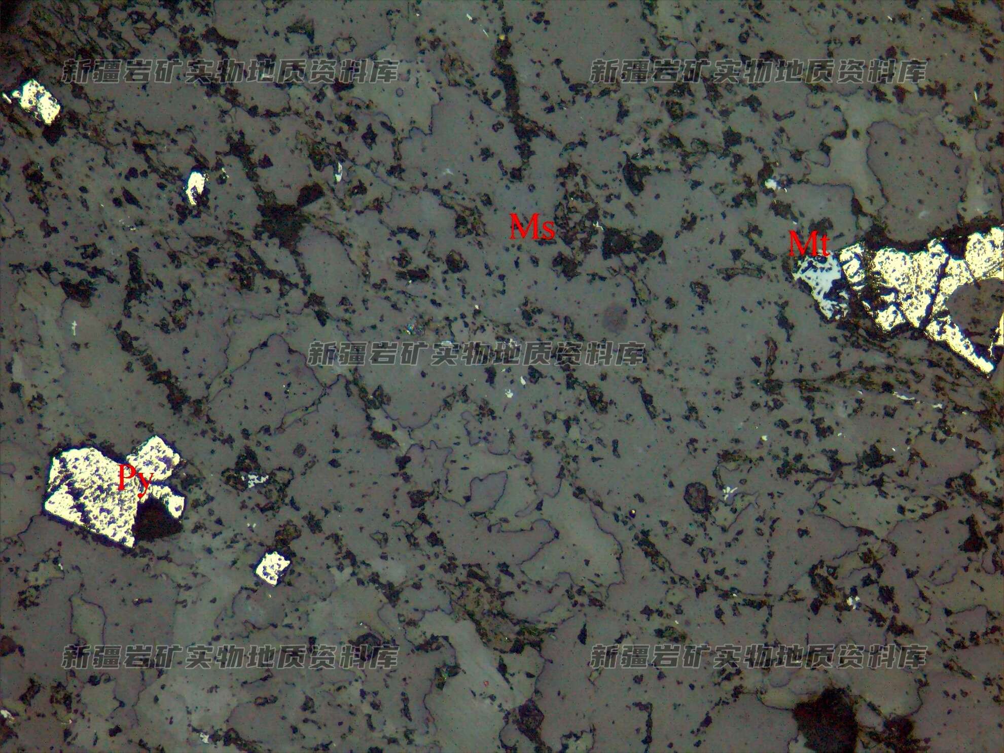 岩石特征描述: 金属矿物磁铁矿(Mt)和黄铁矿(Py)呈星点状分布在透明矿物之间。