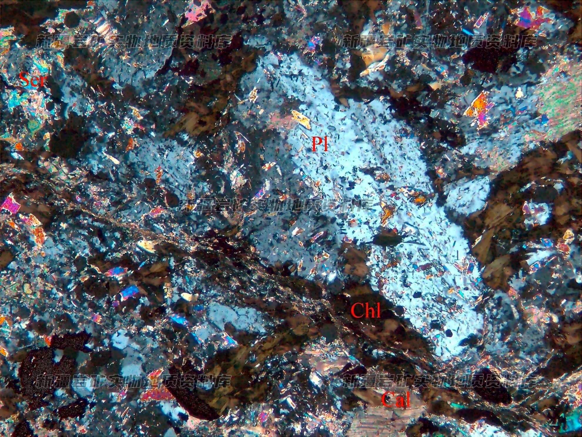岩石特征描述: 岩石中的主要矿物为斜长石(Pl),受应力作用影响,岩石受挤压破碎,并叠加绿泥石(Chl)化、绢云母(Ser)化及方解石(Cal)化等蚀变。