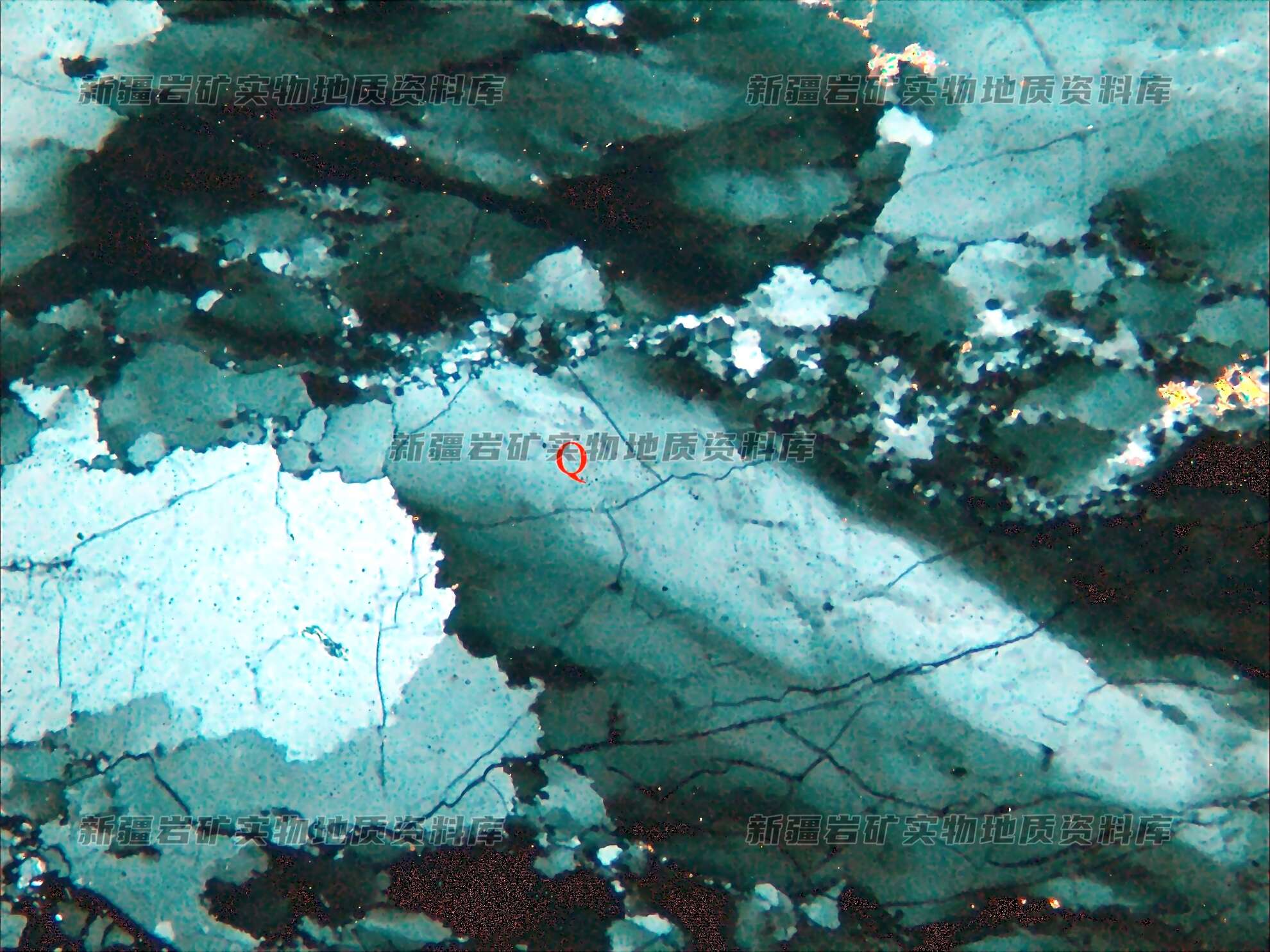 岩石特征描述: 岩石由石英(Q)等构成,受应力活动影响,石英被压碎,并具明显波状消光。