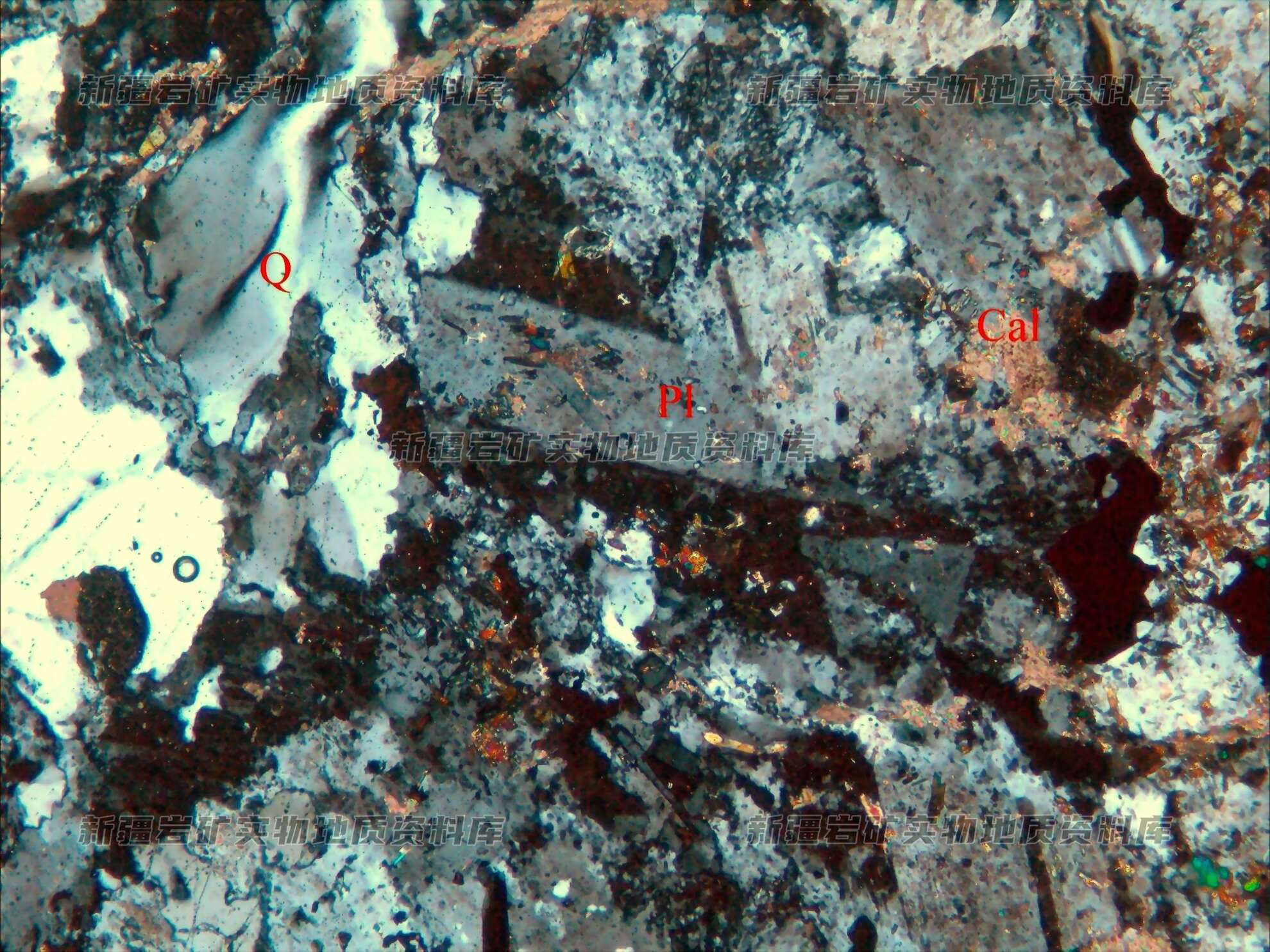 岩石特征描述: 岩石由斜长石(Pl)和少量的石英(Q)等组成,叠加明显方解石(Cal)化、绿泥石化及帘石化。