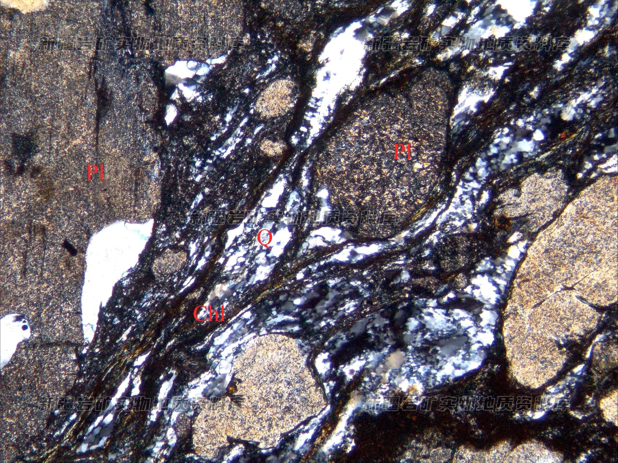 山羊须构造是由压碎的斜长石(Pl)和新生矿物细粒石英(Q)及绿泥石(Chl)等次生矿物构成,长石已被粘土矿物交代,呈拉长的碎粒状分布,石英和绿泥石在其端部形成山羊须构造。