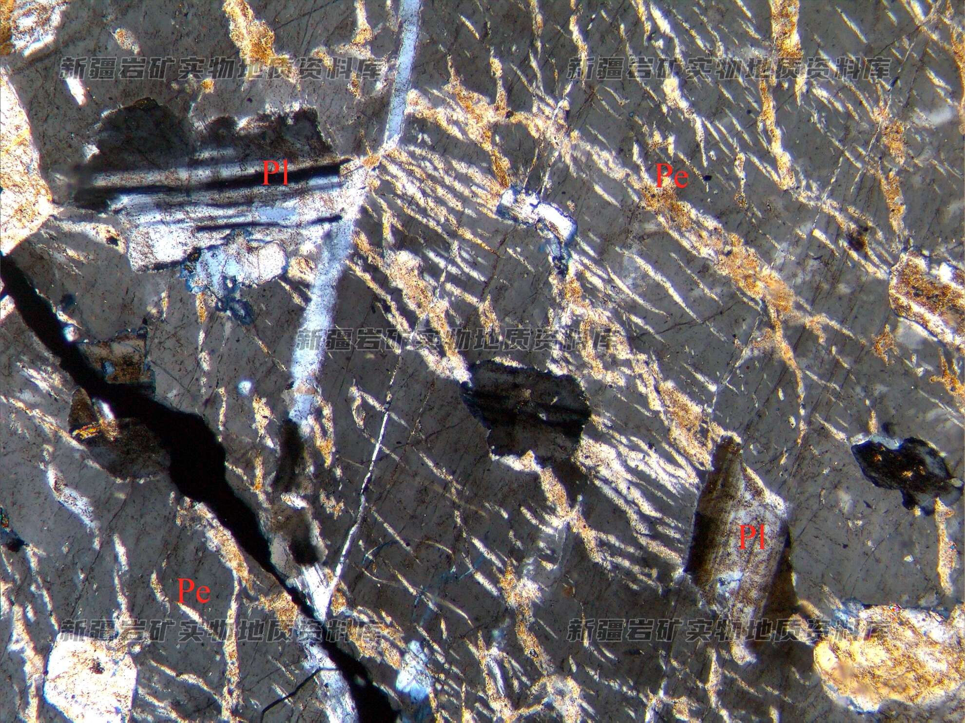 在钾长石之条纹长石(Pe)中的斜长石(Pl)残留体。