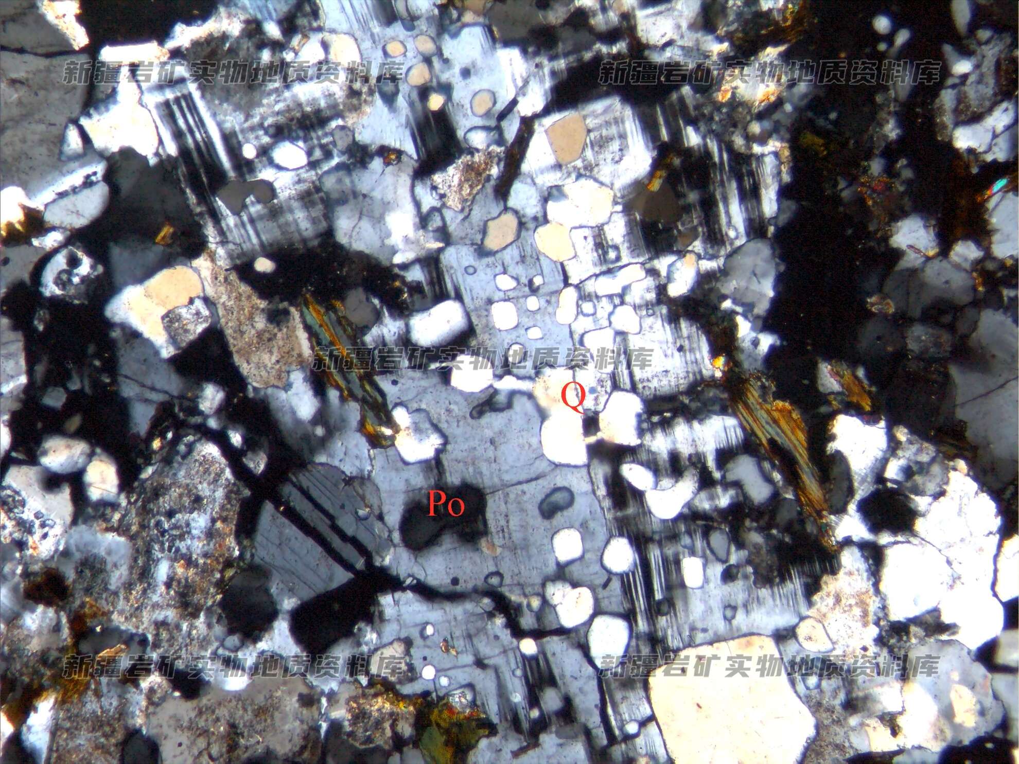 在钾长石(Po)变斑晶中包含有细粒石英(Q)包体。