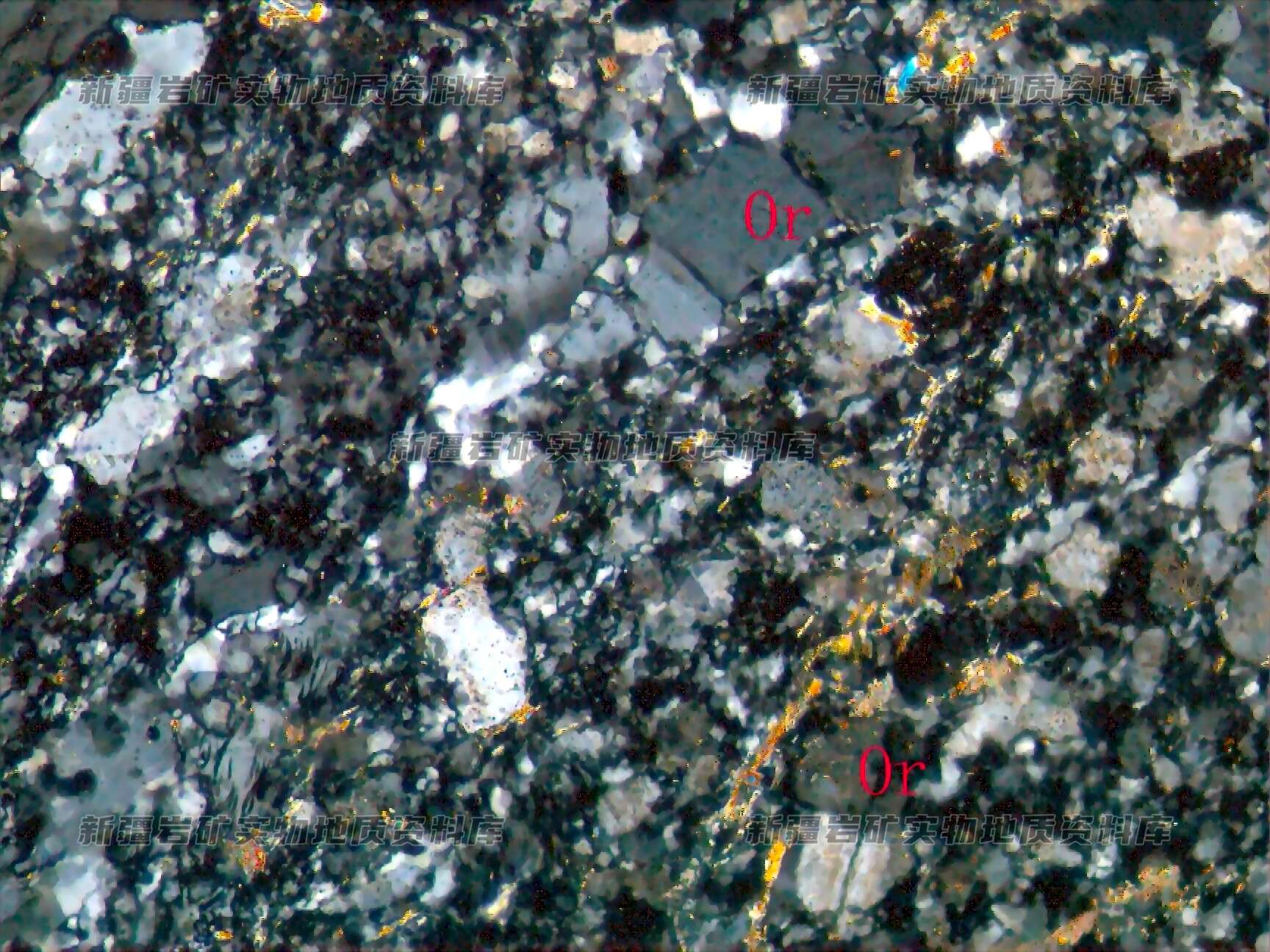 原岩经糜棱岩化作用,大部分被压碎及重结晶,部分钾长石(Or)、石英呈残余状分布。