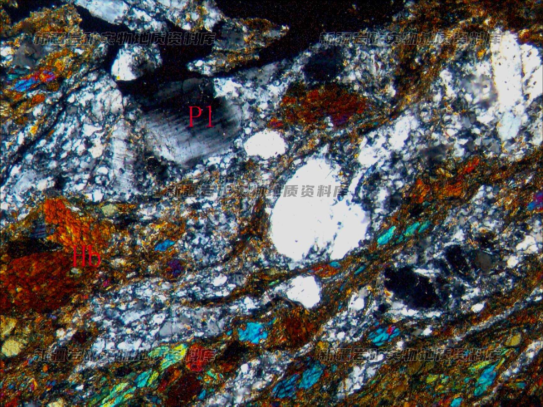 由普通角闪石(Hb)、斜长石(Pl)及钾长石等构成,经糜棱岩化作用,产生破碎及动态重结晶,形成细粒长英矿物集合体。