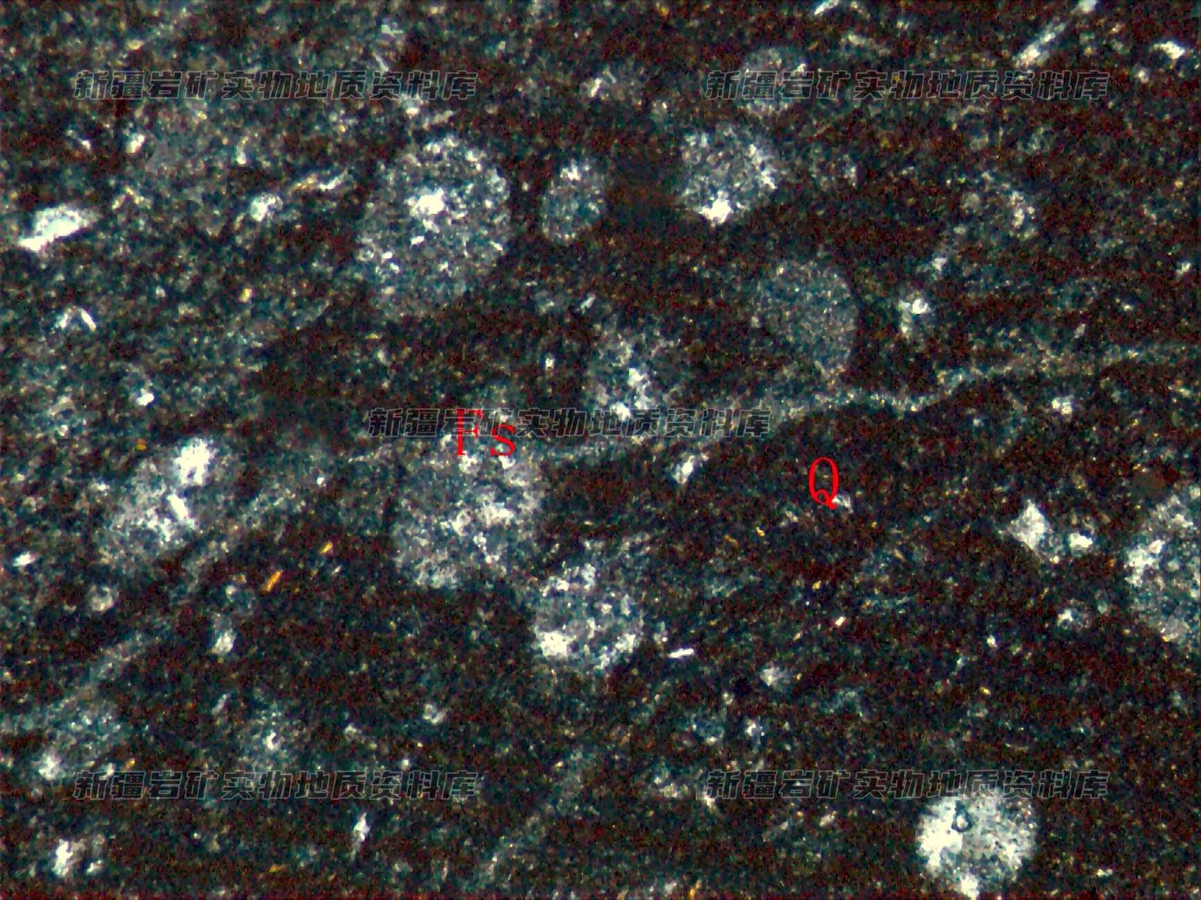 岩石由放射虫(Fs)、晶屑及火山灰尘物质等构成,晶屑为长石和石英,火山灰尘具轻度的重结晶现象,形成隐晶质长英质(Q)和粘土矿物。