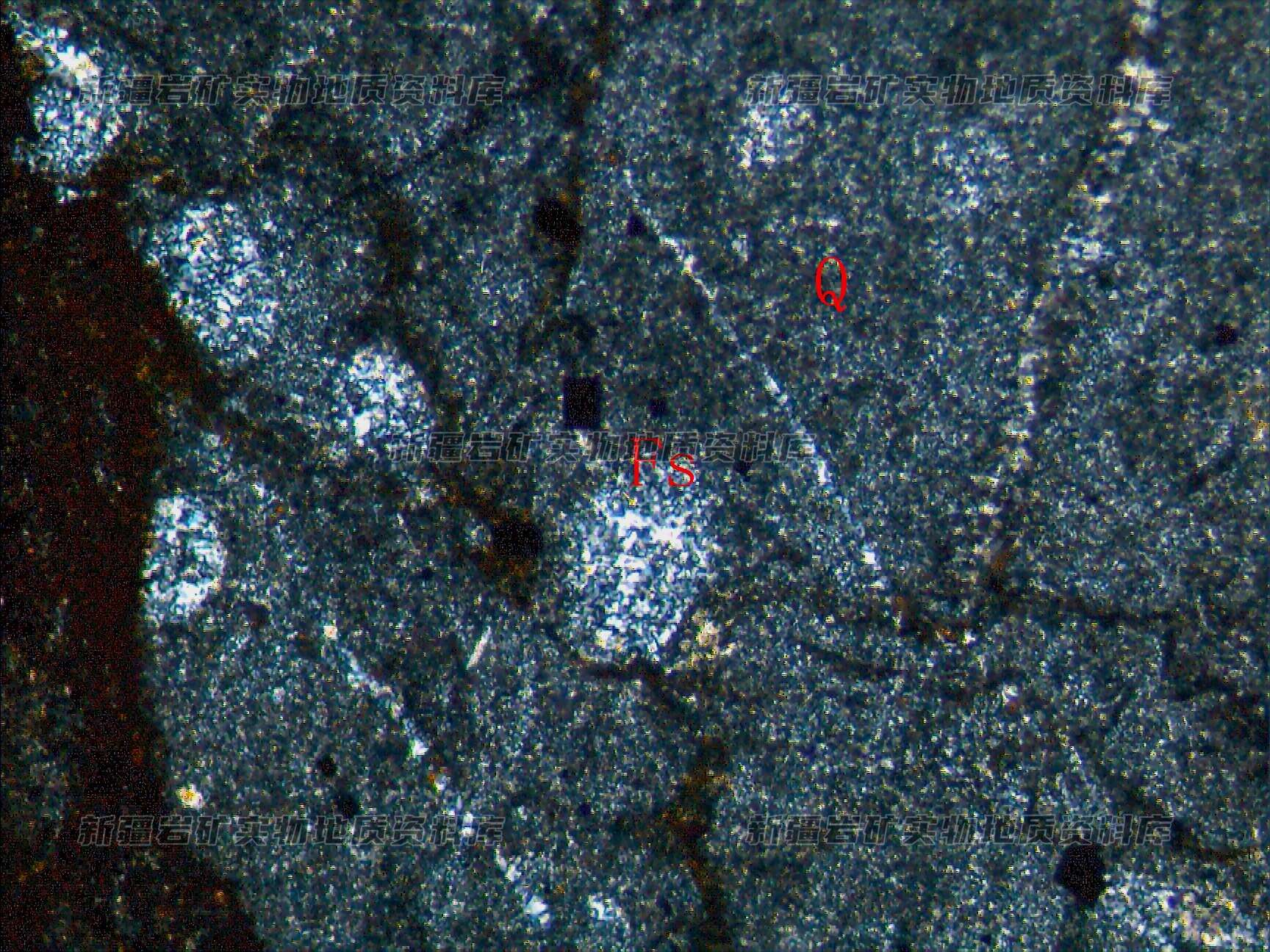 岩石由少量的放射虫(Fs)和隐晶质石英集合体(Q)构成,并穿插有石英脉。
