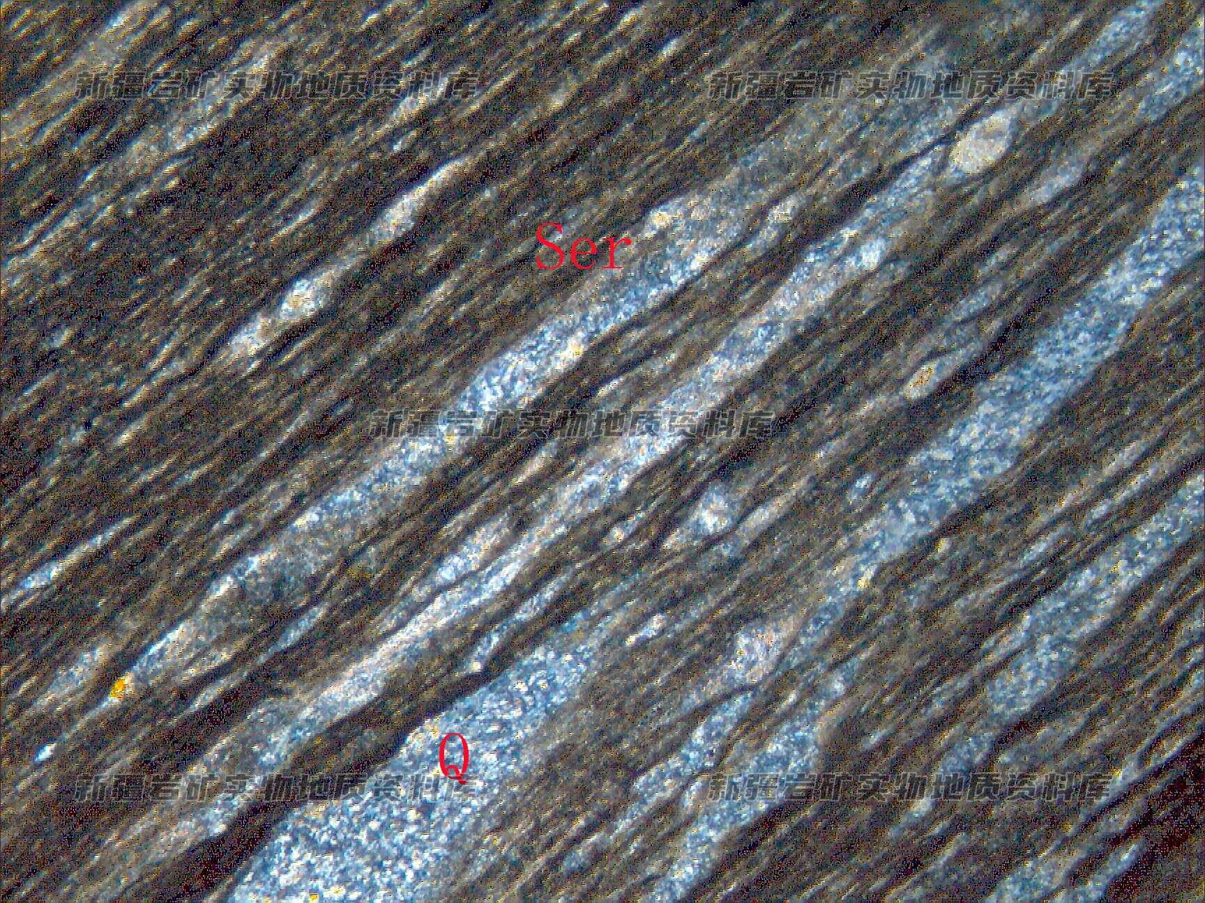 岩石由绢云母(Ser)、绿泥石及细粒石英(Q)等构成,沿长轴方向定向排列,其中含较多炭质。