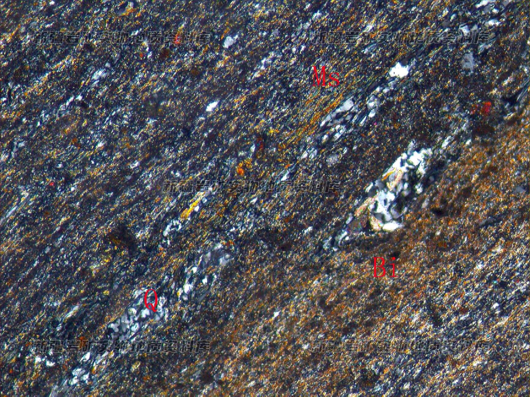 岩石由黑云母(Bi)、白云母(Ms)、石英(Q)及帘石类矿物构成,沿长轴方向定向排列,云母以黑云母为主,白云母量少。