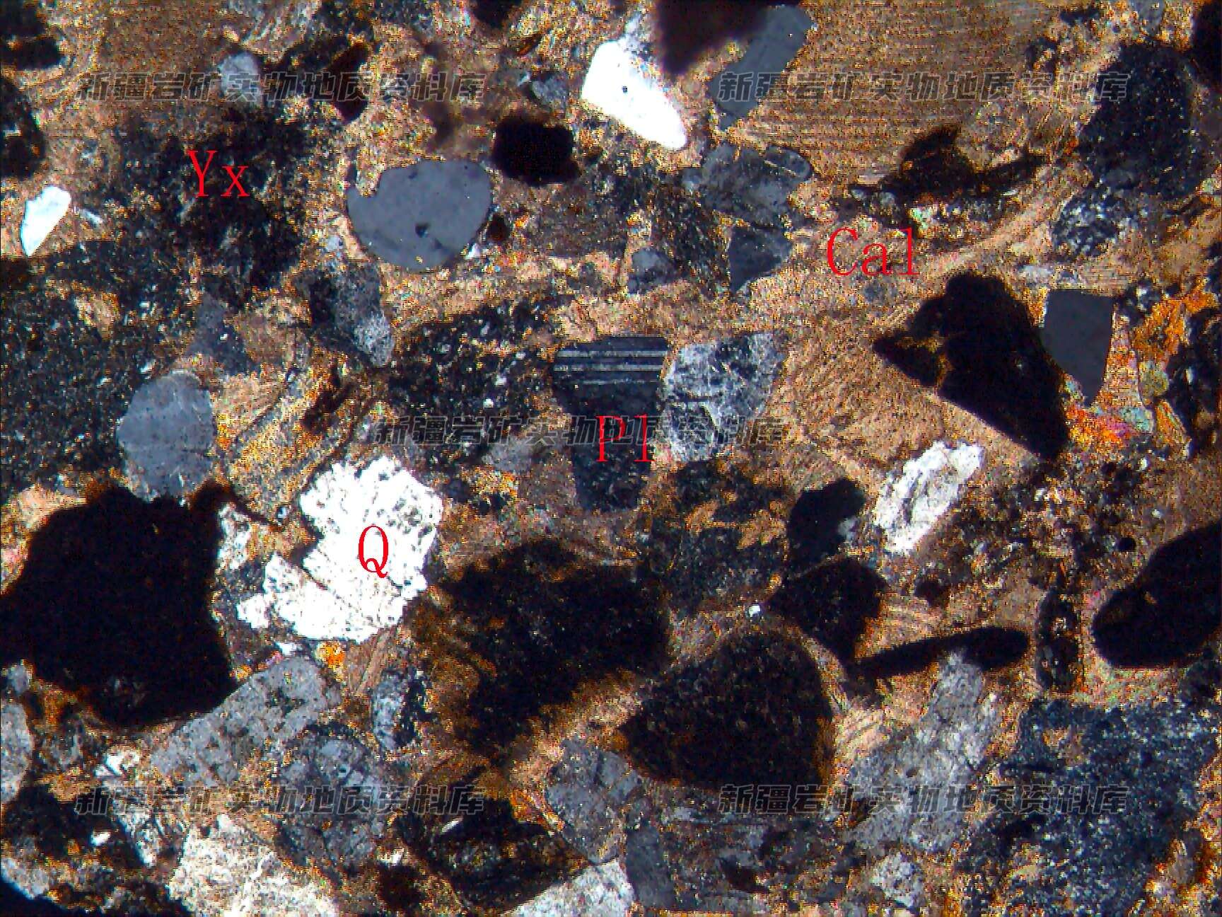 岩石由岩屑(Yx)、长石(Pl)、石英(Q)碎屑及钙质胶结物(Cal)组成,碎屑形态呈次棱角状、次园状分布,方解石充填在碎屑中间。